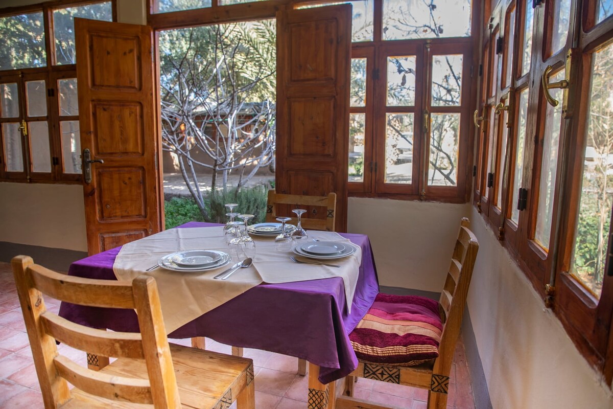 kasbah er staðsett við skoluána . Hvert herbergi er með sturtum og salernum. Kasbah skipuleggur gönguferðir í mikilli atlas eða eyðimörk ásamt ýmsum athöfnum (jóganámskeið, matreiðslunámskeið, distillery heimsókn osfrv.). Þetta er fullkominn staður til að slaka á og slaka á.