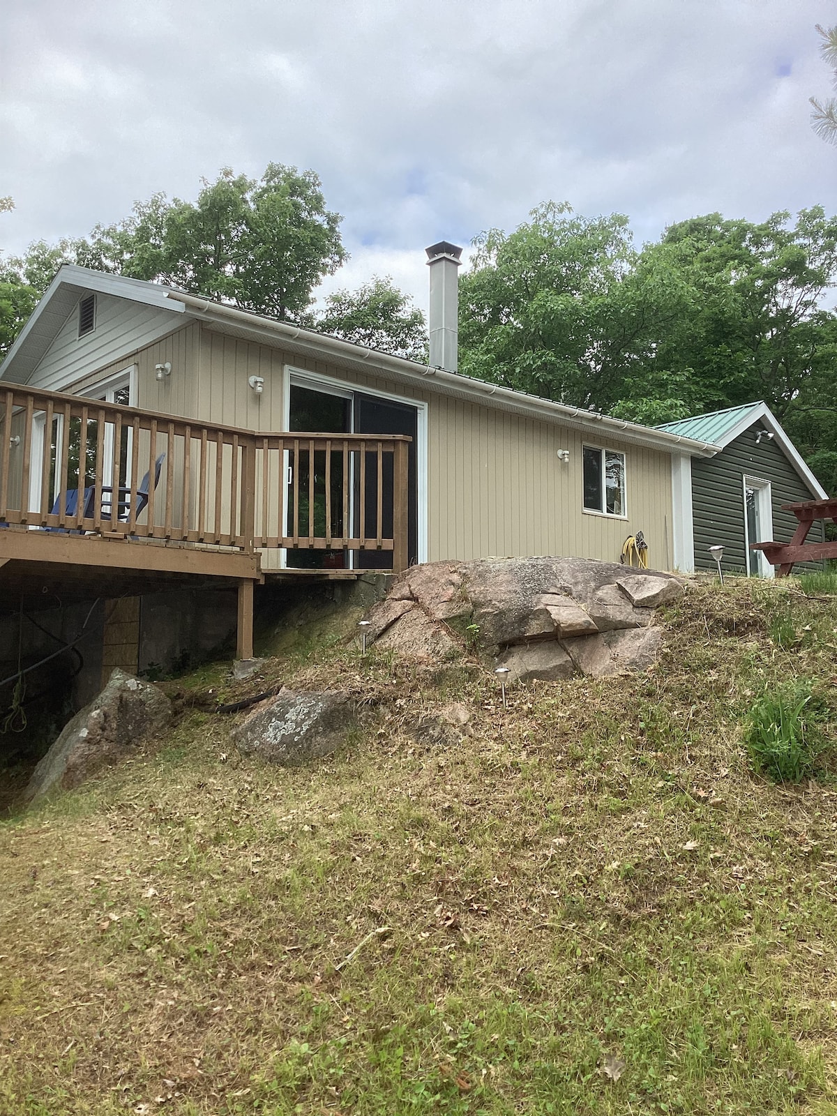 (Vinsamlegast hafðu í huga að eftir 1. júlí 2022 er HST innifalið í skráningarverðinu) Bústaðurinn „Rock, Pine and Sunlight“ er staðsettur í 30 km fjarlægð norður af Kingston og býður upp á rólegt afdrep fyrir ferðamenn og borgarbúa sem vilja hressa upp á og upplifa útivist. Afþreying er til dæmis kanó-/kajakferðir, veiðar og gönguferðir, gönguskíði og snjóþrúgur. Athugaðu að „svefnherbergi 3“ er til einkanota. Það er umlukið samanbrotnum skjá, ekki hurð. Rúmið er tvíbreitt svefnsófi (futon). Herbergið hentar börnum best.