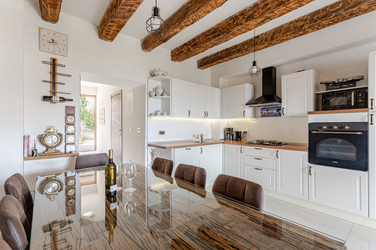 Fallega húsið er staðsett beint við sjóinn í Kali, fiskimannaþorpi við Ugljan með heillandi þorpum og óteljandi ólífutrjám. Íbúðin er með næstum 4 m háu viðarbjálkalofti og millihæð og er með útsýni yfir lítið athvarf með mörgum fiskibátum.