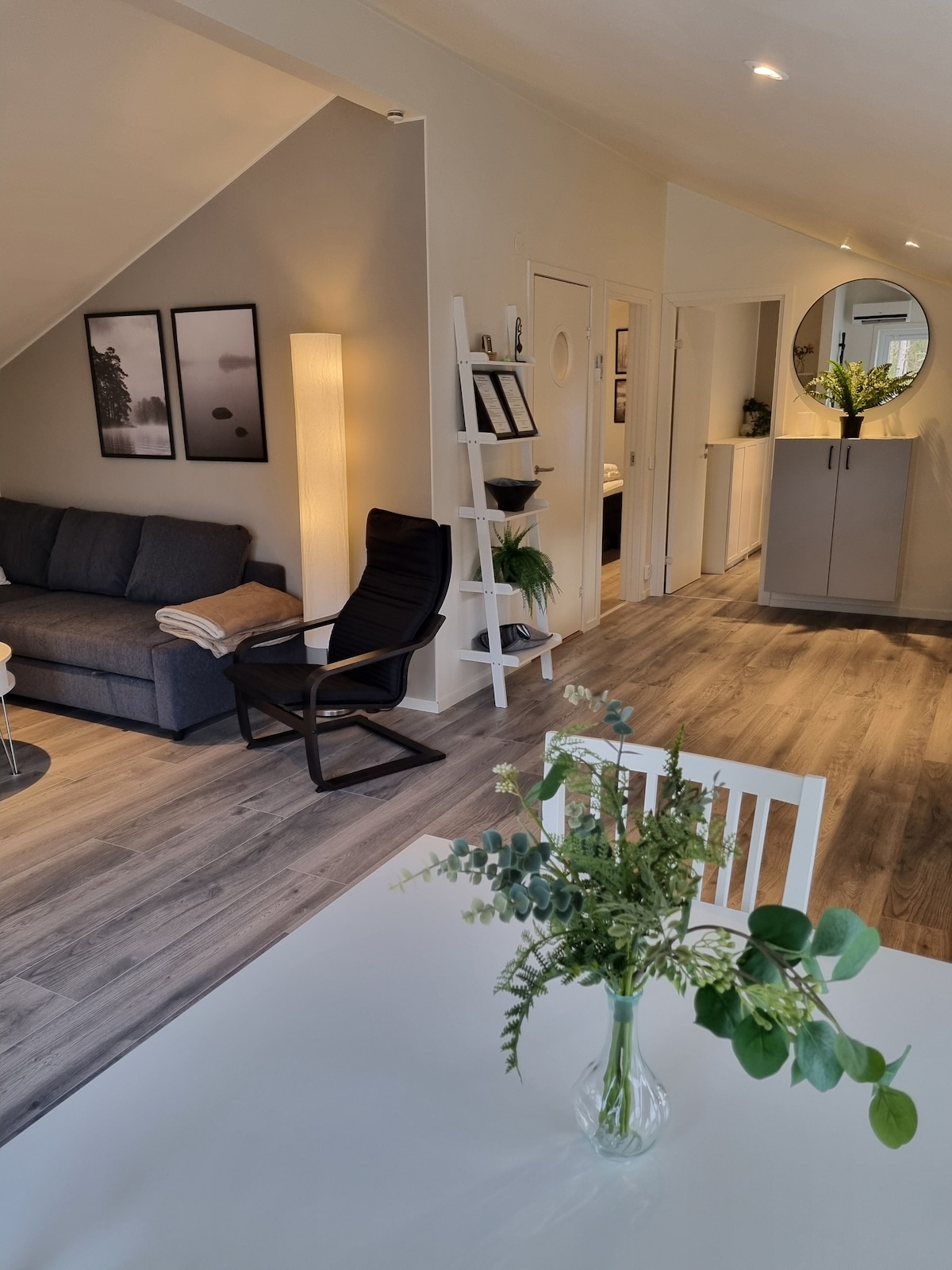 Miðlæg staðsetning í rólegu íbúðahverfi með bílastæði og gufubaði, þvottahúsi og þurrkara. Þú sem gestur verður með sérinngang og aðgang að eigin verönd með garðhúsgögnum og bílastæði. Eldhúsið er vel búið með uppþvottavél. Samtals 4 svefnpláss, hjónarúm og í svefnsófa í afskekktum herbergjum. Gistiaðstaðan er rúmgóð, 65 fm. Á sumrin er eignin svöl og góð. Við bjóðum einnig upp á nokkur reiðhjól sem eru innifalin í leiguverðinu. Sjálfsinnritun fer fram í gegnum lyklaskáp með kóða. Nálægt sundi og borg