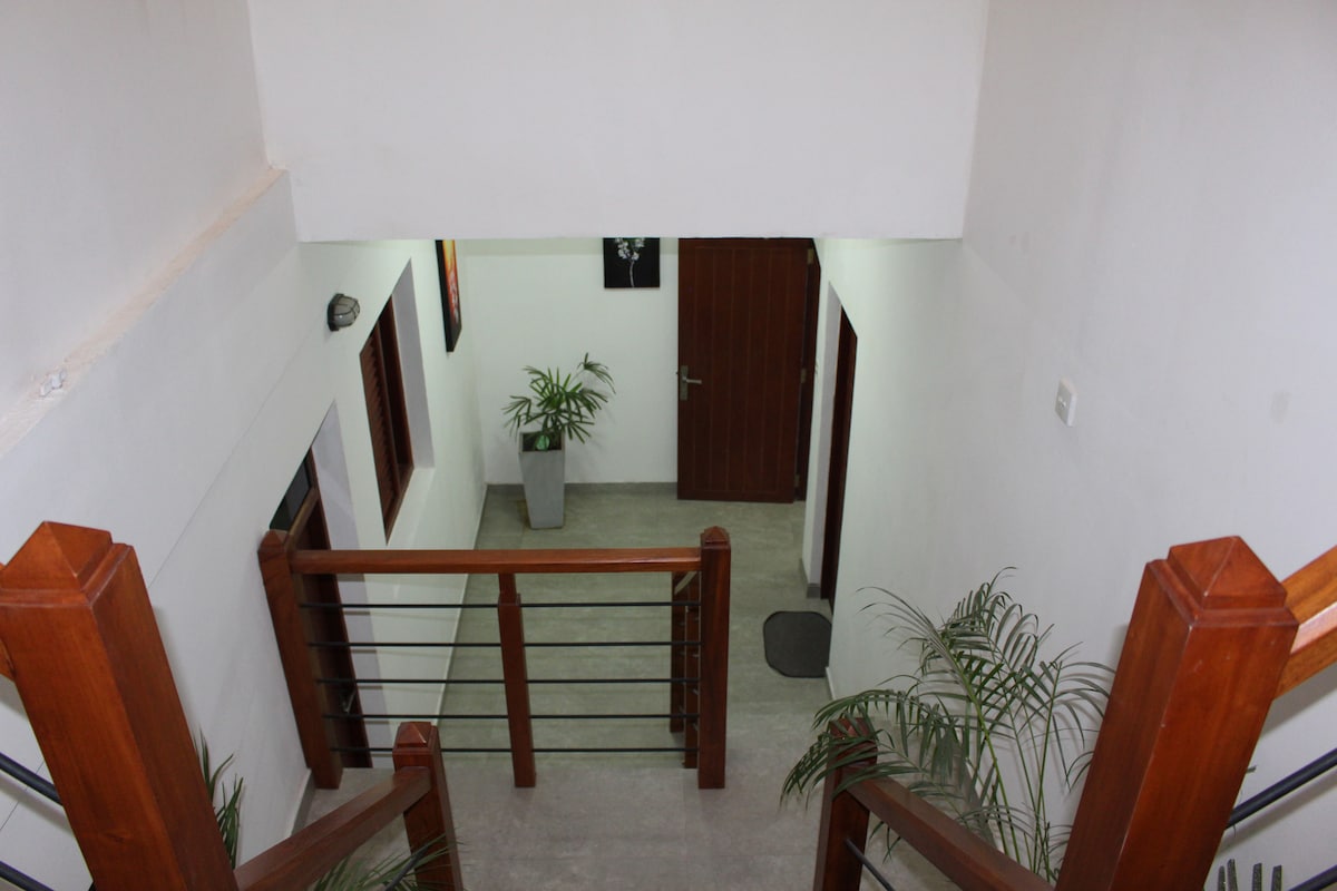 Rúmgott herbergi með loftkælingu og aðliggjandi þvottaherbergi á efri hæð heimilisins okkar. Einingunni er náð með einu flugi með breiðum stiga. Í boði eru tvö rúm (með möguleika á þriðja), veggskápar, fataskápur, vaskur, stórt borð sem tvöfaldast sem vinnuaðstaða/borðstofuborð og eldunaraðstaða. Bókaskápurinn inniheldur staðreyndir og skáldskap og rit eftir gestgjafa á Srí Lanka með þægilegum stólum til að slaka á og lesa. Ljósmyndir og málverk eftir listamenn frá Srí Lanka prýða veggina.