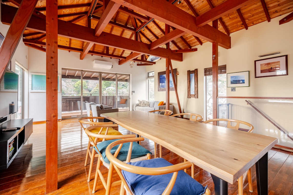 [Heiti aðstöðu: Einkadvalarstaður Atagawa] Þessi einkavilla er staðsett á hæð á Atagawa Onsen-svæðinu með útsýni yfir hafið og fjöllin. Þú getur eytt ótrúlegum tíma í náttúrunni í aðeins 6 mínútna akstursfjarlægð frá næstu stöð, Izu-Atagawa-stöðinni. Frá heita uppsprettunum í rútunni með besta útsýnið getur þú slakað á á meðan þú horfir á glitrandi hafið á morgnana og stjörnubjörtum himni á kvöldin. Njóttu þess að slaka á í gufubaði og horfa á kvikmyndir á stóra skjánum. Grill er einnig í boði á pallinum, sem gerir hann tilvalinn fyrir samkomur fjölskyldu og vina. Sjór, fjöll, heitir laugar, gufuböð og leikhús - allt í einu einstöku og afslappandi rými. Njóttu íburðarmikillar dvöl fjarri daglegu lífi sem mun endurnæra hugarheim þinn og líkama. ■Aðstaða og eldhús Ísskápur, örbylgjuofn, hrísgrjónaeldavél, ketill, brauðrist, kaffivél, þráðlaust net, skjávarpi, hátalarar, trommuþvottavél og þurrkari, hárþurrka, grill (greitt), pottar, pönnur, eldunaráhöld, diskar ■Þægindi Bað, andlit og tannburstar (fyrir 1 dvöl) Líkamsþvottur, hárþvottalögur og hárnæring Þvottaefni, kaffibaunir ■Bragðbætir Salt, pipar, sojasósa, ólífuolía