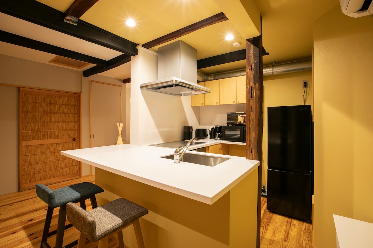 Kynnstu sjarma fallega uppgerðrar Kyoto machiya þar sem hefðbundin japönsk byggingarlist mætir skandinavískri hönnun. Þessi einkaleiga býður hópnum þínum upp á allt húsið sem tryggir friðsæla dvöl í rólegu húsasundi. Njóttu kyrrðarinnar í litlum garði á jarðhæðinni sem er fullkominn fyrir smá íhugun. Fjölskylduvæn þægindi, þar á meðal borðbúnaður fyrir börn, leikföng, barnavagn og barnastóll, gera þetta að fullkomnu afdrepi fyrir alla aldurshópa.