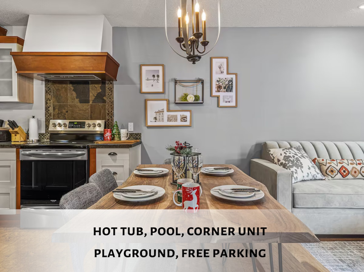 Við greiðum 15% þjónustugjald Airbnb fyrir þig! 7 mínútna akstur til Banff-þjóðgarðsins Þessi glæsilega íbúð með 1 svefnherbergi á jarðhæð er vel staðsett í virtu samfélagi og býður upp á hágæða þægindi, þar á meðal beinan aðgang frá veröndinni að heita pottinum. Heill með fullbúnu eldhúsi, fallega skreyttum stofum og nálægt matvöruverslunum og veitingastöðum, það er fullkominn grunnur til að skoða kanadísku Rockies. Svítan er á jarðhæð og er ekki með fjallasýn.