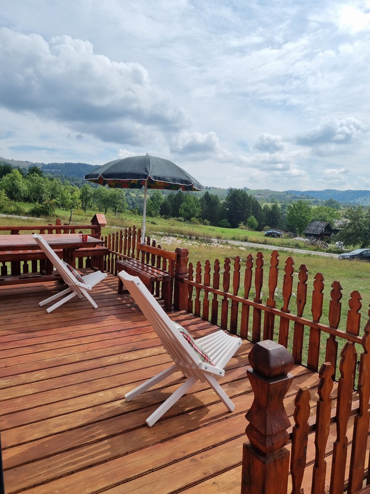 Spend your time in a beautiful cottage on eco estate under Bjelasica mountain with traditiIn a beautiful natural environment the cottage is is positioned to give you the pleasure of sunrise, unreal view of the mountain peaks. The exterior of the cottage is characterized by a large green rhapsody of various trees, green meadows. 1km from main road The calet was built that from every part of it you can see the mountain massif of Bjelasica mountain Hot tube on request-40€additional payment