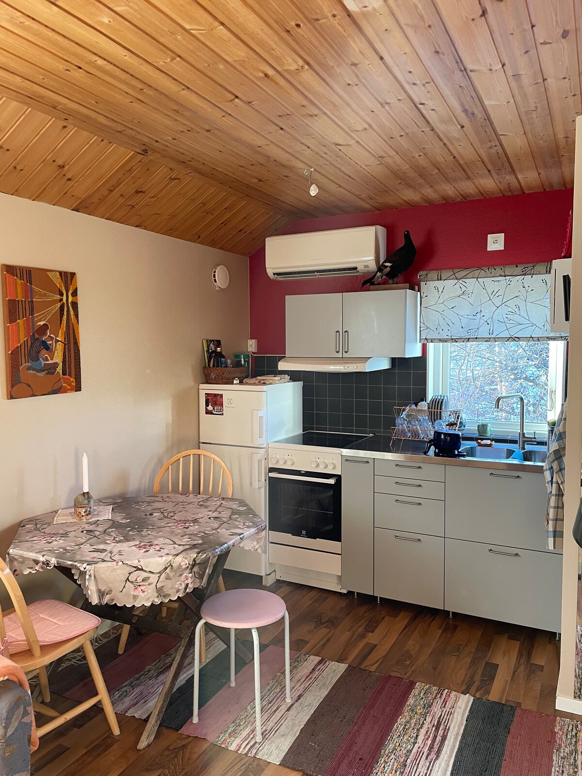 Sjóstugan - perlan okkar við sjóinn! Einkahús með svefnlofti, eldhúsi, fallegu stóru herbergi með arineldsstofu og útsýni yfir vatnið. Eldsneytiskofa með baði í vatninu rétt við hliðina. Heitur pottur á bryggjunni - alltaf heitur. Bryggja 5 metra fyrir utan dyrnar. Aðgangur að bát. Ef þið viljið kaupa fiskimiða, hafið samband við gestgjafa. Viður fyrir ofn og gufubað er innifalinn. Garðurinn er afgirtur alla leið að vatninu og Beagle hundurinn okkar, Vide, er oft laus. Hann er góður. Lök, handklæði og þrif eru innifalin.
