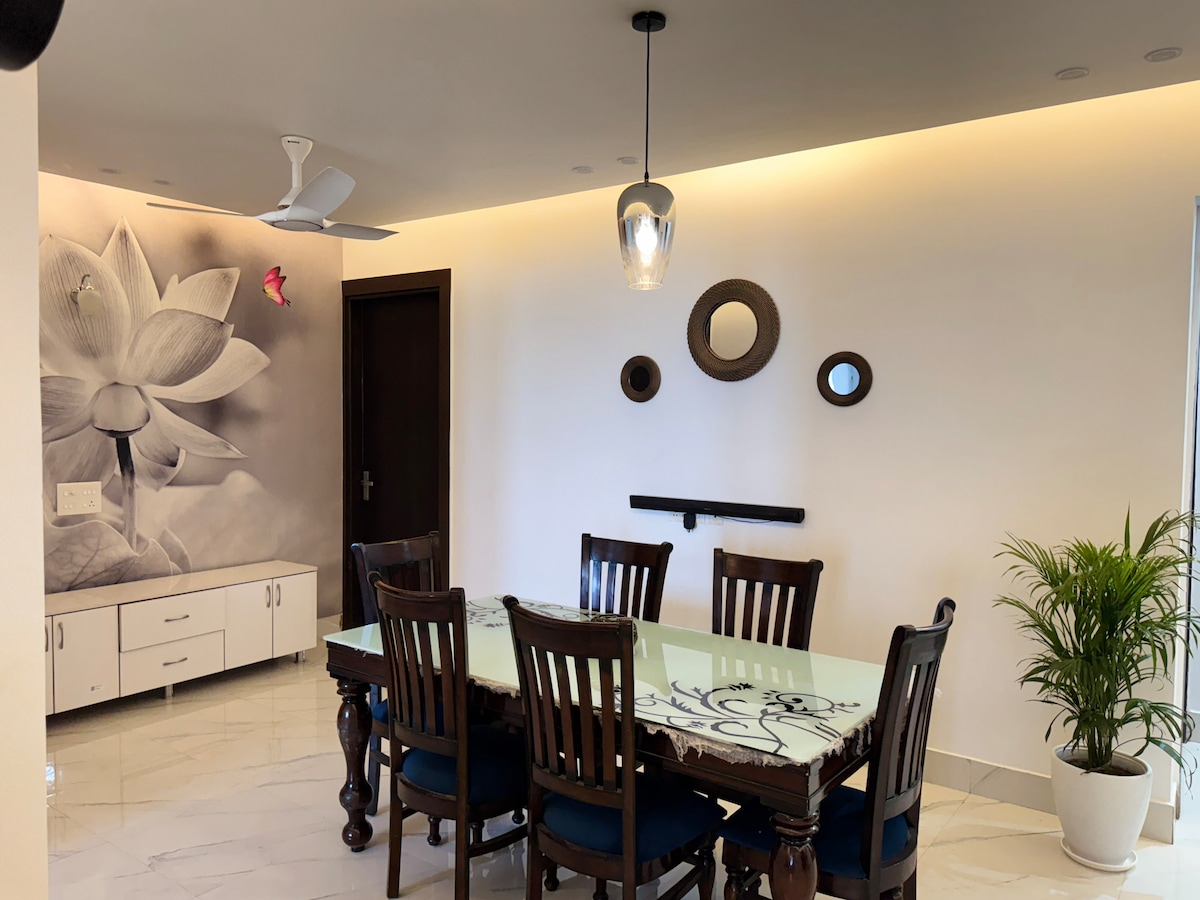 Friðsæl, rúmgóð og parvæn íbúð: - glæsileg stofa: bækur, borðspil - hlaðið eldhús - fallegt svefnherbergi: Sjónvarp með DTH (100s af rásum) og OTT öppum (acnt reqd) -: opið útsýni yfir Gurgaon - hreint baðherbergi - vinnustöð - stefnumótandi staðsetning: Auðvelt aðgengi frá NH48, Dwarka Expressway, SPR, American Express, Air India, TCS, Skyview Corporate Park, DLF Corporate Greens - gjaldfrjálst bílastæði - verslunarmiðstöðvar, Inox, pöbbar og veitingastaðir í sama húsnæði - leigubíla allan sólarhringinn