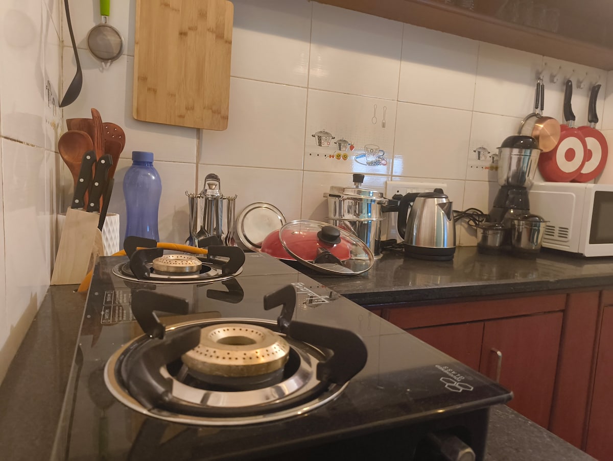 Þetta glæsilega 1BHK við Sarjapur Road, staðsett við hliðina á Play Arena. Húsið er notalegt og með aðliggjandi svölum í herberginu með fallegu borgarútsýni sem hentar vel fyrir afslappaða morgna eða afslöppun á kvöldin. Stofan er úthugsuð með mjúkum sófa, 40 tommu snjallsjónvarpi og aðskildu borðplássi fyrir þægilega dvöl. Í fullbúnu einingaeldhúsinu er ísskápur, örbylgjuofn, vatnshreinsir og öll nauðsynleg áhöld sem gera dvöl þína þægilega og þægilega.