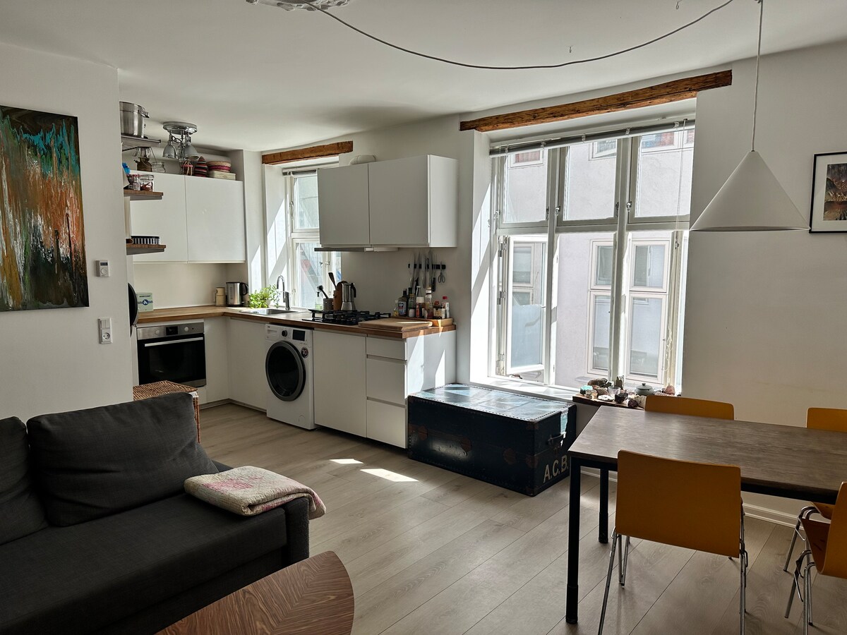 Ég býð ykkur velkomin að gista á heimili mínu í Kaupmannahöfn - aðeins 2 neðanjarðarlestarstöðvum frá miðborginni (Kongens Nytorv) og ströndinni (Amager Strand). Í hverfinu Amagerbro færðu aðgang að góðum kaffihúsum í nágrenninu, til dæmis Mad & Kaffe (við götuna mína), Wulff & Konstali (dögurður við vatnið) og Alice (bakarí og besti ísinn). Íbúðin er steinsnar frá fjölfarna veginum og er tengd grænum húsagarði svo að þú getir notið friðsælla stunda á milli þess sem þú skoðar borgina.