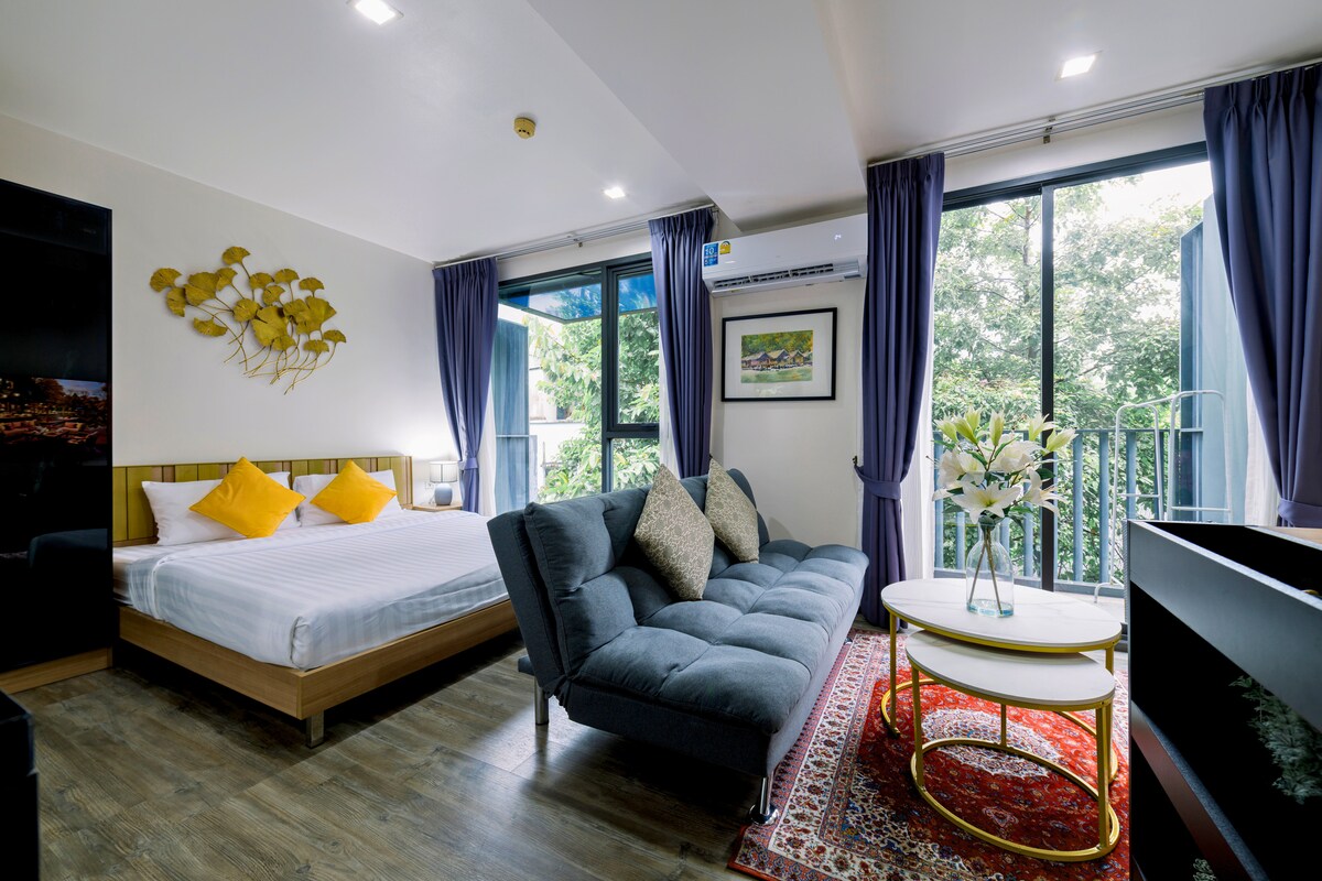 芭东核心位置,步行3分钟到达芭东海滩,一室一厅49平方,包豪斯风格现代公寓