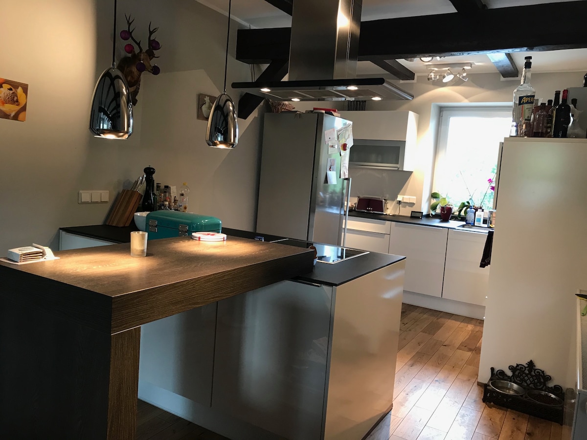 Eignin þín er á jarðhæð í bóndabýli sem byggt var í kringum 1900. Þú getur notað garðinn með garðinum saman. Rúmgóð, nútímalega innréttuð eldhússtofa, baðherbergi og tvö svefnherbergi eru með nægu plássi til að slaka á. The fast fiber optic connection makes also comfortable work possible. Eldhúsið er búið spaneldavél, uppþvottavél, ísskáp, katli og kaffivél.