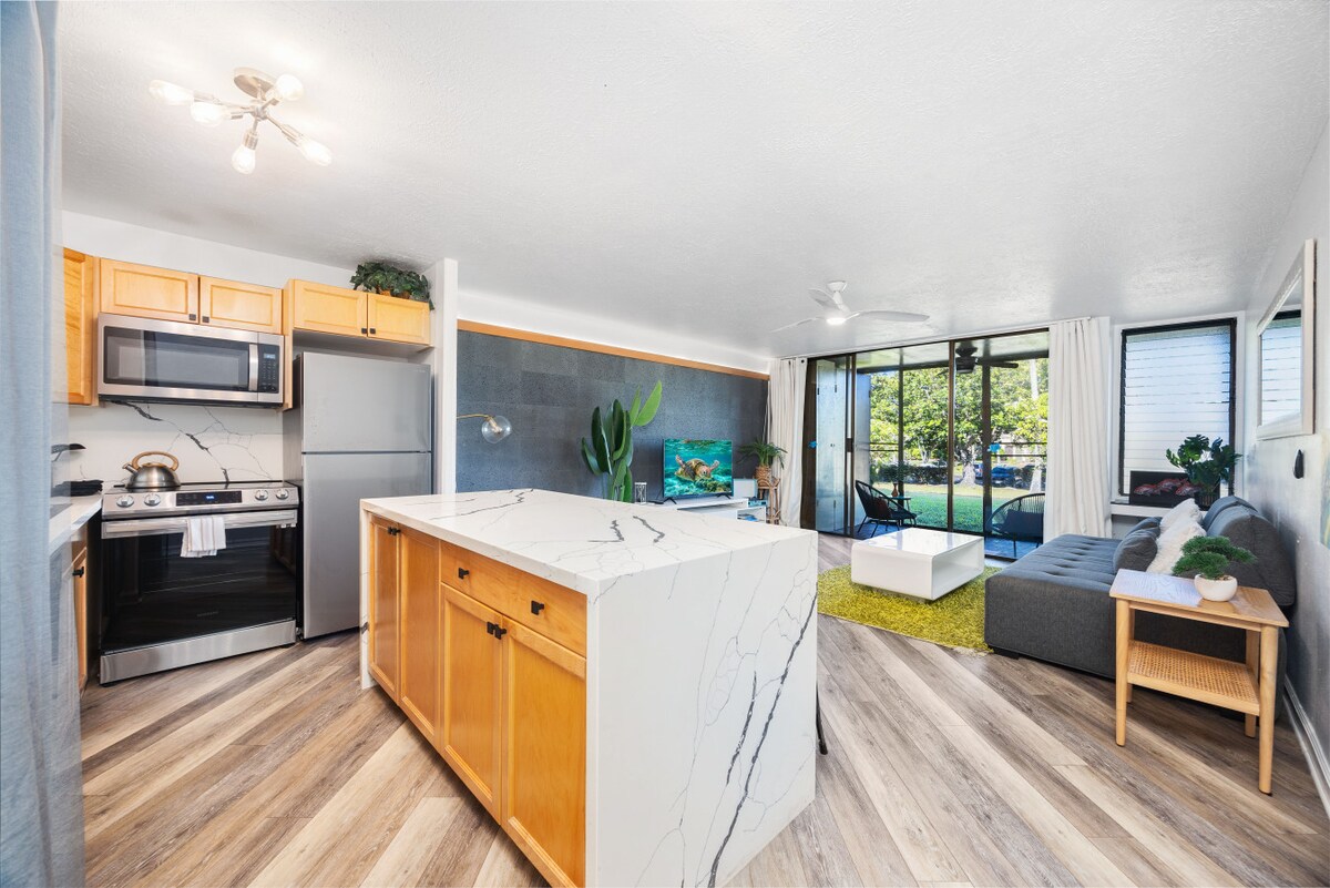 Komdu og njóttu þessarar nýuppfærðu hönnunar, rúmgóðu íbúðarhúsnæðis í fallegu Turtle Bay. Það er eins þægilegt og það er fallegt. Hvort sem það er morgunverður í rúminu eða drykk á lanai sveiflunni gætirðu ekki viljað yfirgefa þessa hitabeltisparadís. Allt hefur verið uppfært, þar á meðal handvalin pendants sem hægt er að deyfa til að henta skapi þínu. Sundlaug, strönd og suðrænar gönguleiðir eru í nágrenninu. Veitingastaðir og verslanir er að finna á hinu nýuppgerða Turtle Bay hóteli.