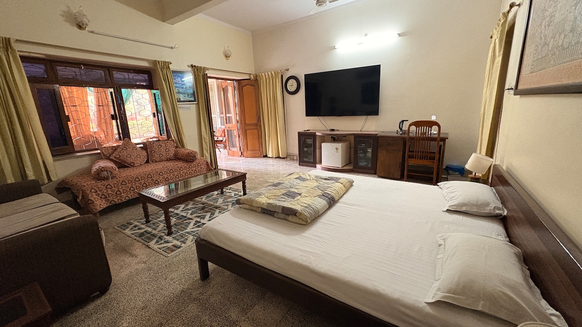 Forget your worries in this spacious and serene space. Experience comfort and serenity at Pushp-Raj, located just 11 km from the railway station and 14 km from the airport. Major attractions lie within 10–15 km. The property offers 3 spacious AC rooms with king-size beds, attached washrooms, and changing rooms. Enjoy a 55" TV with soundbar, Wi-Fi, dining area, mandir, kitchen, common terrace, and free parking. Ideal for families, corporates, and foreign guests seeking a calm, luxurious stay.