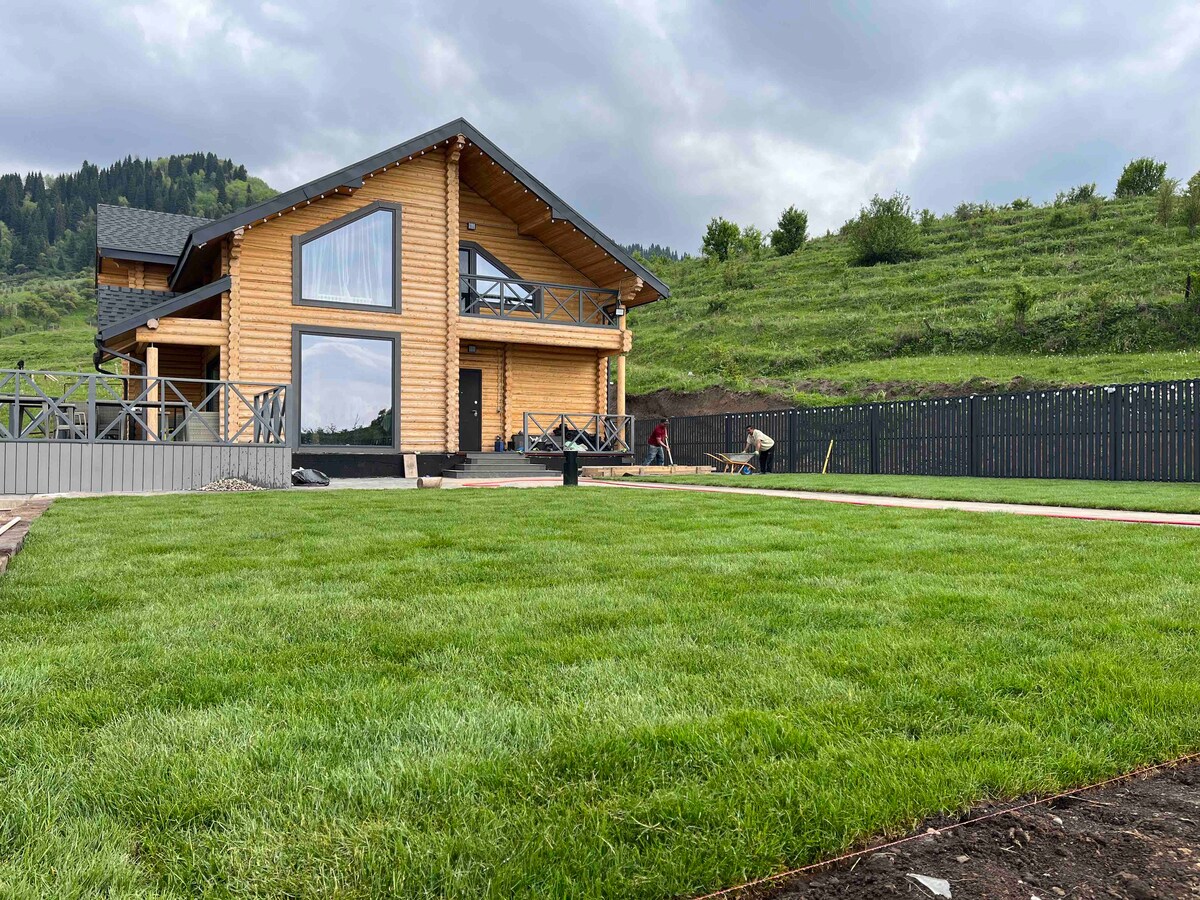 A-ramma hús í Pik Talgar Eco Village. Aðeins klukkustundar akstur frá Almati, með stórkostlegu útsýni, ljúffengum morgunverði og ferskasta fjallaógi. Á rúmgóðu svæði okkar finnur þú: * Grillsvæði fullbúin með verkfærum og kolum * Yurt Café með heimagerða rússneska og kóreska rétti * Notaleg eldstæði * Daglegar gönguferðir um eignina og tækifæri til að hitta dýrin okkar * Gufuböð í þorps- og Khan-stíl með meðferðum í boði með fyrirfram bókun