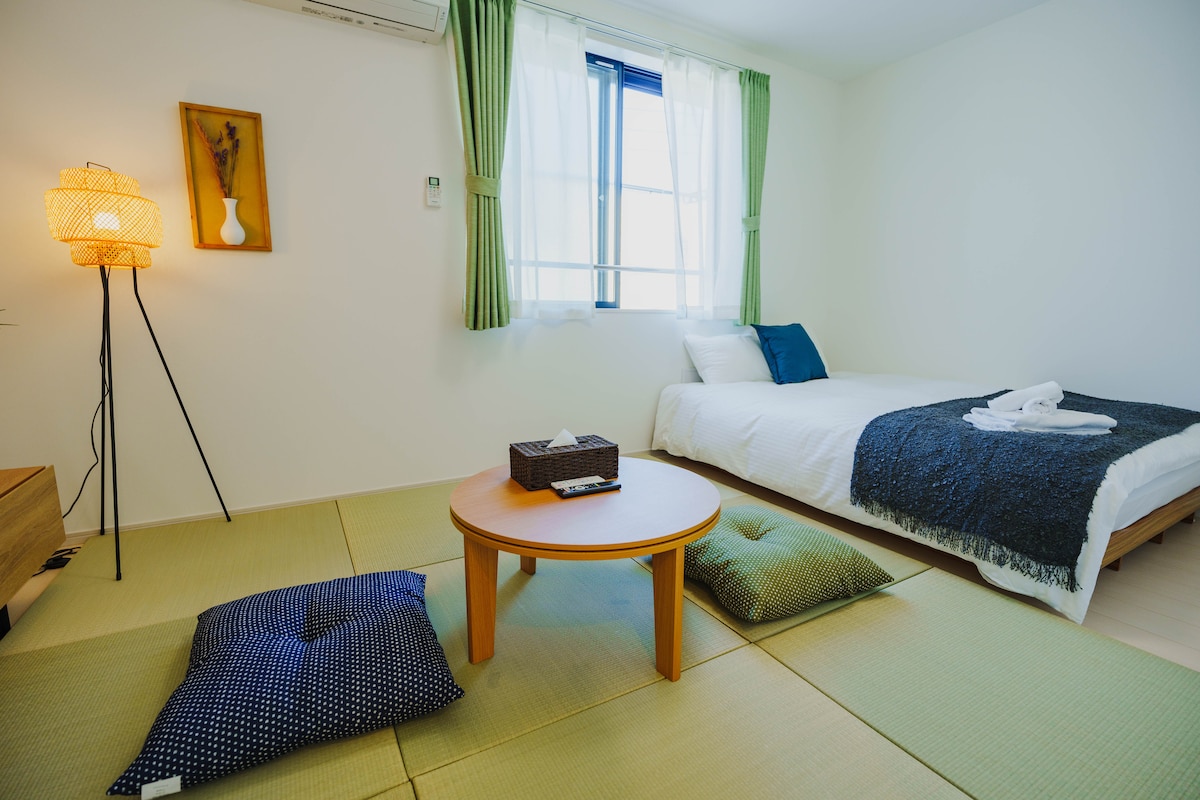 Eitt, fimm herbergi, þrjú baðherbergi og tvö baðherbergi.Eldhús og borðstofa.Rúmar 10 manns á sama tíma og hentar fjölskyldum og litlum hópum! Á fyrstu hæðinni er um 10 fermetra tatami-herbergi og tveggja metra stórt rúmherbergi er lítil stofa á milli herbergjanna tveggja. Önnur hæðin er tatami-herbergi sem er um 12 fermetrar að stærð, borðstofa í eldhúsi, hægt að elda og eldunaráhöld. Eitt herbergi á þriðju hæð er herbergi með einu rúmi.Eitt þeirra er 135 metra herbergi með tvíbreiðu rúmi. Á hverri hæð er baðherbergi og vaskur og baðherbergin tvö eru á fyrstu hæð og annarri hæð. Það er lítill garður með sérstökum reykingastað! Það eru tvö ókeypis bílastæði við hliðina á húsinu fyrir tvær gerðir af bílum sem taka ekki fleiri en 10 manns í sæti!