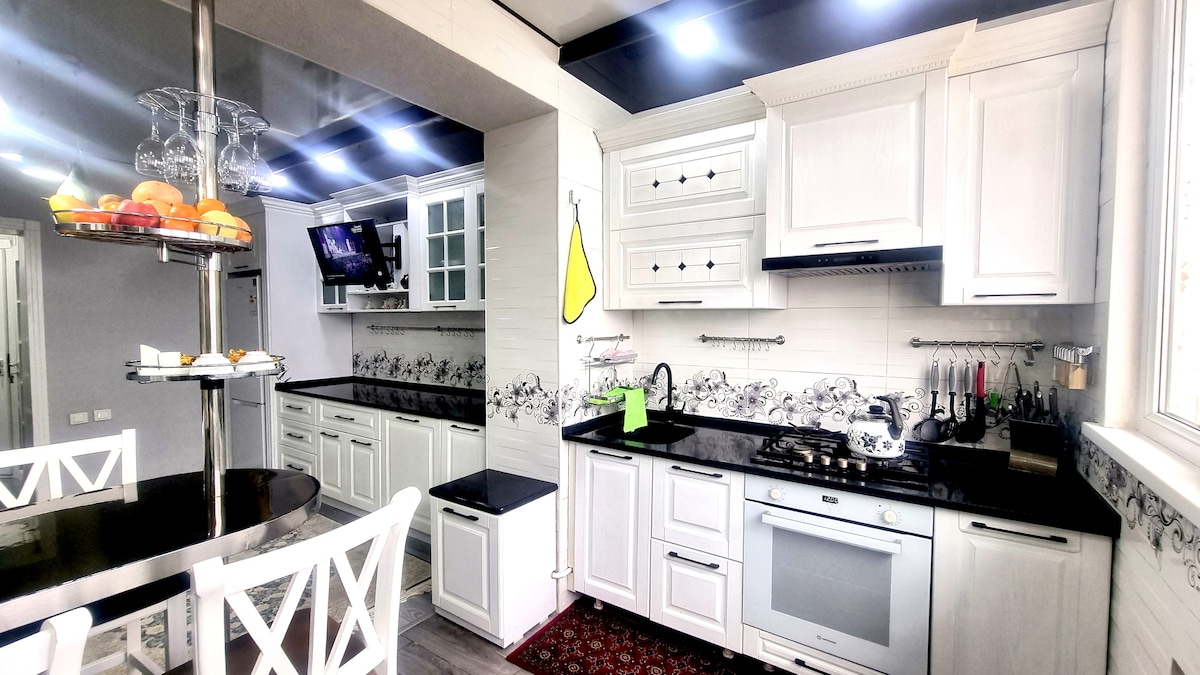Ný íbúð frá reyndum ofurgestgjöfum með einstakt útsýni yfir Amir Temur Avenue, „hvíta“ mosku og húsnæði í Kasakstan. Hágæða gluggar veita ró og næði í íbúðinni. Innan 1 km radíus eru Alai Bazaar, þrjár neðanjarðarlestarstöðvar, heilmikið af kaffihúsum og veitingastöðum í mismunandi verðflokkum, tískuverslanir, banki, skiptiskrifstofa, stór matvörubúð, 5 litlar verslanir, japanskur garður, vatnagarður, moska osfrv. Við innganginn er læsing á kóða, myndeftirlit og ný lyfta.