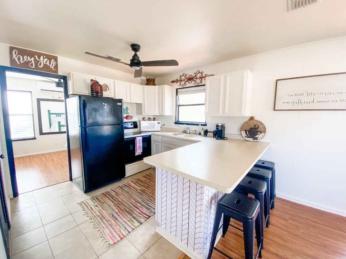 Verið velkomin á hæðina á 135 hektara búgarðinum okkar. Við erum staðsett í hjarta Texas Hill Country með nálægð við allt! Dog Trot Guest Suites okkar samanstendur af 2 svítum hver með queen-size rúmi, viðbótar svefnaðstöðu (dagrúmi eða trunnel) og sérbaði. Útsýnið okkar er stórkostlegt og stjörnurnar á kvöldin eru stórar og bjartar! Við erum skammt frá Old Tunnel State Park, James Kiehl River Park, Sister Creek Winery, matgæðingum og hellum. Vonast til að sjá þig fljótlega!