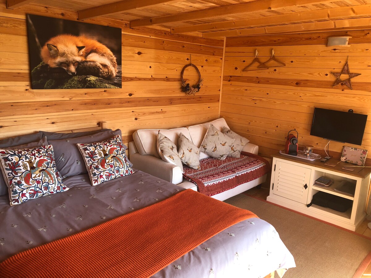 Falleg gisting með útsýni yfir akra og skóglendi, í friðsælu og einkalegu umhverfi fjarri öllum vegum, státar af öllu sem þú þarft fyrir afslappandi dvöl, þar á meðal eigin heitum potti, sturtuklefa, WC og eldhúskrók með tækjum, til að búa til morgunverð eða snarl. Grillið á veröndinni er einnig með gashring. Svefnherbergi/ setustofa er með snjallsjónvarp, DVD og ókeypis WiFi. Allt gistirýmið er lokað fyrir stjörnuskoðun þegar þú slakar á í pottinum. Fab fyrir hjólreiðar og gönguferðir! Bath Xmas markaður