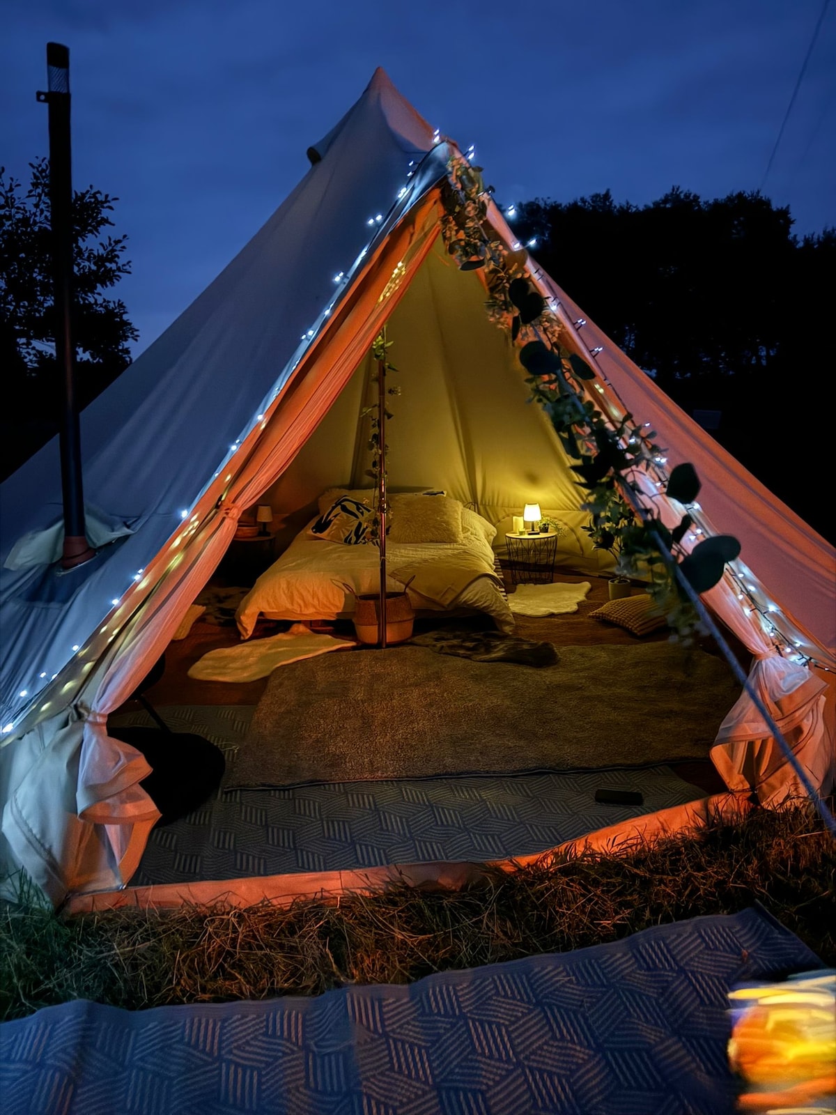 A charming bell tent. A budget friendly version of glamping. This large bell tent is unfurnished. Offering a hassle-free, comfortable, and time-saving camping experience, perfect for both beginners and seasoned campers looking to enjoy the great outdoors with minimal fuss. This is an unfurnished, the tent will already be erected upon your arrival, all you have to do is bring the rest of the camping equipment. It sleeps 2 to 4 guests.