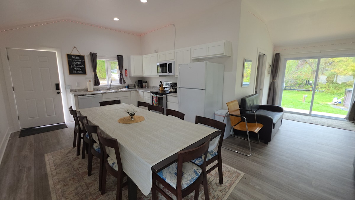 Yndislegt og stórt rými innan- og utandyra sem er rólegt, friðsælt og þægilegt með öllum glænýjum (2023) rúmum, húsgögnum, sjónvarpi, eldhústækjum, teppi og fleiru. Þú getur slakað á í þessari næstum 2400 fermetra einingu sem er þrifin og viðhaldið af fagfólki. Verönd með þægindum, fullbúnu eldhúsi, stórri stofu, tveimur fullbúnum baðherbergjum (sturtu og baðkeri), tveimur svefnherbergjum (King & Queen), læstu æfingaherbergi og fullbúnu þvottahúsi. * Húsið skiptist í tvennt. Eigendurnir verða ekki á staðnum*