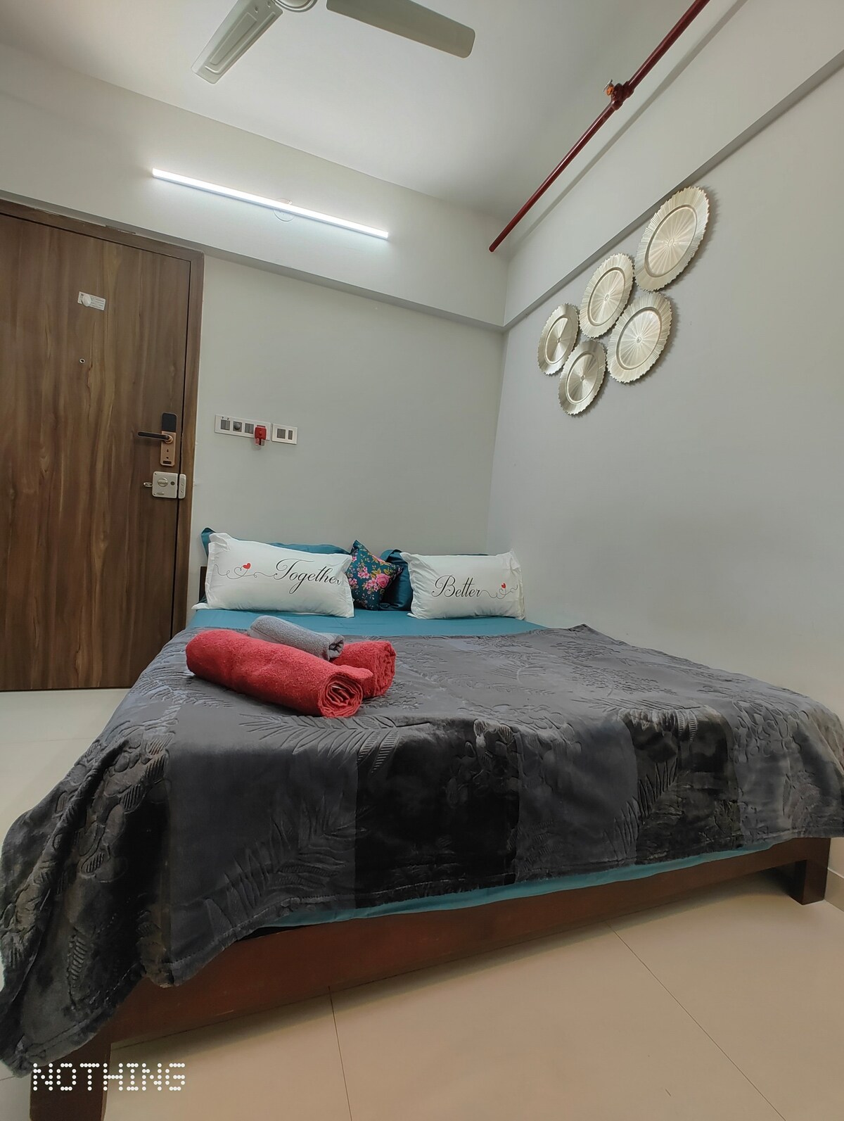 Welcome to our brand-new, spacious 2-BHK apartment, ideal for families and couples seeking comfort and convenience. The bedrooms have queen size beds with orthopedic mattresses and AC for a restful night's sleep. Relax in the large living room with a 43-inch Smart TV, lightning-fast WiFi and a dedicated dining area. Comes with two super clean bathrooms stocked with bath essentials. The fully equipped kitchen includes high-quality appliances and crockery for your culinary adventures!