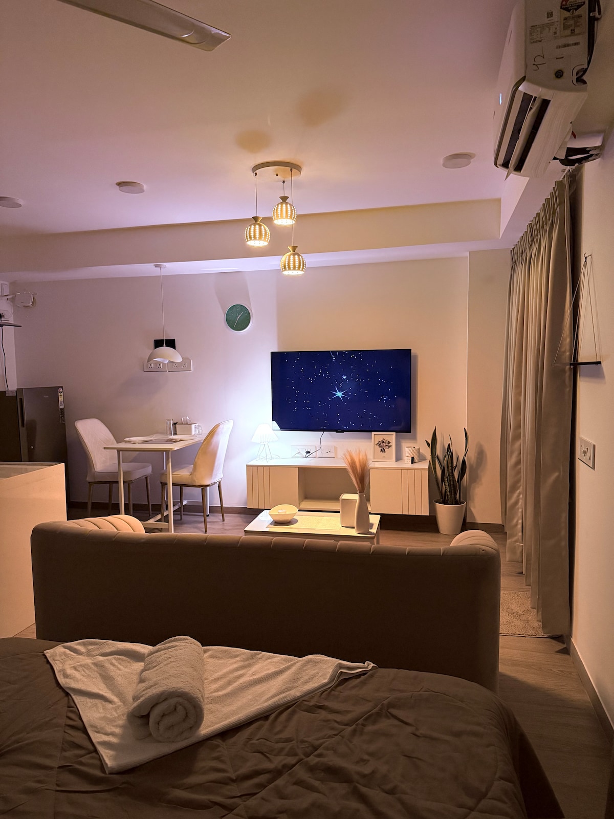 Verið velkomin til Kuteeram - heimili þitt að heiman! Þessi glæsilega íbúð með 1 svefnherbergi er fullkomlega staðsett með mögnuðu útsýni yfir sjóndeildarhringinn og nútímaþægindum. Hvort sem þú ert hér vegna viðskipta eða skemmtunar býður íbúðin okkar upp á fullkomna blöndu af kyrrð og þægindum. Þú verður í göngufæri frá verslunarmiðstöðvum sem bjóða upp á afþreyingu, mat og verslanir. Íbúðin okkar er hönnuð með þægindi þín í huga og býður upp á friðsæla heimilislega gistingu. Bókaðu núna og upplifðu það besta sem borgin hefur upp á að bjóða!