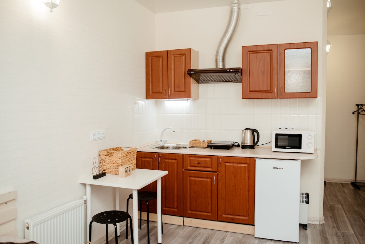 Í íbúðinni er þægilegt pláss fyrir tvo fullorðna + eitt barn, í bjarta herberginu er hjónarúm, fataskápur/hengi fyrir föt. Eldhúsið er búið öllu sem þú þarft til að útbúa gómsætar máltíðir. Í íbúðunum eru öll nauðsynleg heimilistæki: LED-sjónvarp, ísskápur, þvottavél, hraðsuðuketill, örbylgjuofn, hárþurrka, straujárn, strauborð, nauðsynlegir diskar, þráðlaust net, rúmföt, handklæði, inniskór, fljótandi sápa, sjampó, te og drykkjarvatn.
