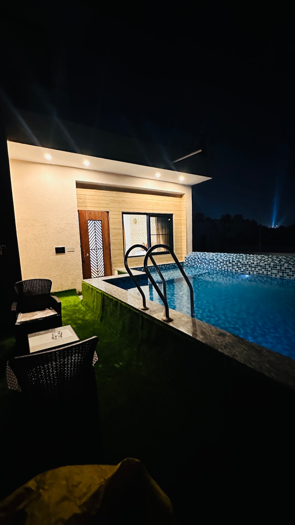 Taktu alla vini og fjölskyldu með á þennan frábæra stað þar sem nóg pláss er til að skemmta sér - Öll stór herbergi eru búin 55 tommu sjónvarpi. - Rúmgóð, hrein og fallega innréttuð innanhúss - Eitt herbergi með einkasundlaug sem er 225 fermetrar að stærð - Hratt þráðlaust net og snjallsjónvarp - Fullbúið eldhús - Allar nauðsynjar - Heitt vatn og loftræsting allan sólarhringinn - Einkasvalir - 2 bílastæði - Nauðsynjar fyrir baðherbergi - Biotique - Hleðsla rafbíls ₹ 1.200 Fullkomin fyrir pör og fjölskyldur sem eru að leita að stílhreinni og friðsælli gistingu með góðum tengingum
