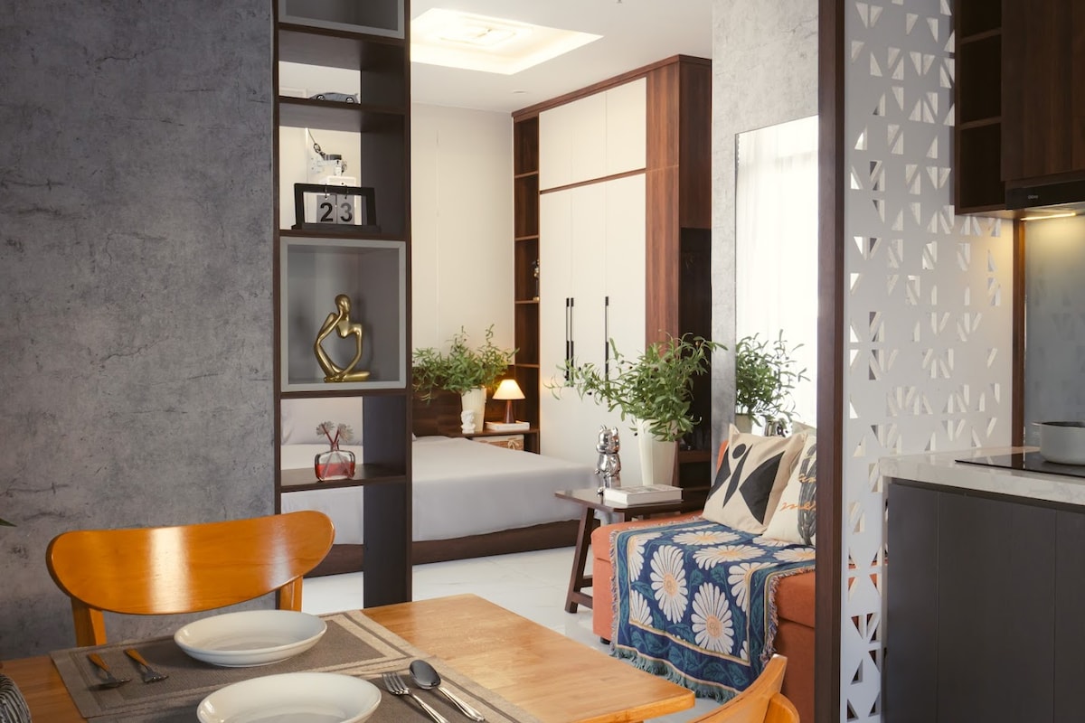 Upplifðu Da Nang frá lofti í þessari björtu og glæsilegu stúdíóíbúð á 4. hæð. Njóttu víðs útsýnis yfir borgina frá einkasvölunum þínum og nægilegs náttúrulegs birtu frá stórum gluggum. Eignin er opin og friðsæl og býður upp á blöndu af minimalískri hönnun og notalegum þægindum. Rúmgóð vinnustöð með þægilegum stól er við gluggann sem veitir þér rólegum og hvetjandi stað til að lesa, vinna eða einfaldlega njóta golunnar. Fullkomið fyrir ferðamenn sem leita að rólegu og nútímalegu lífi nálægt borginni.
