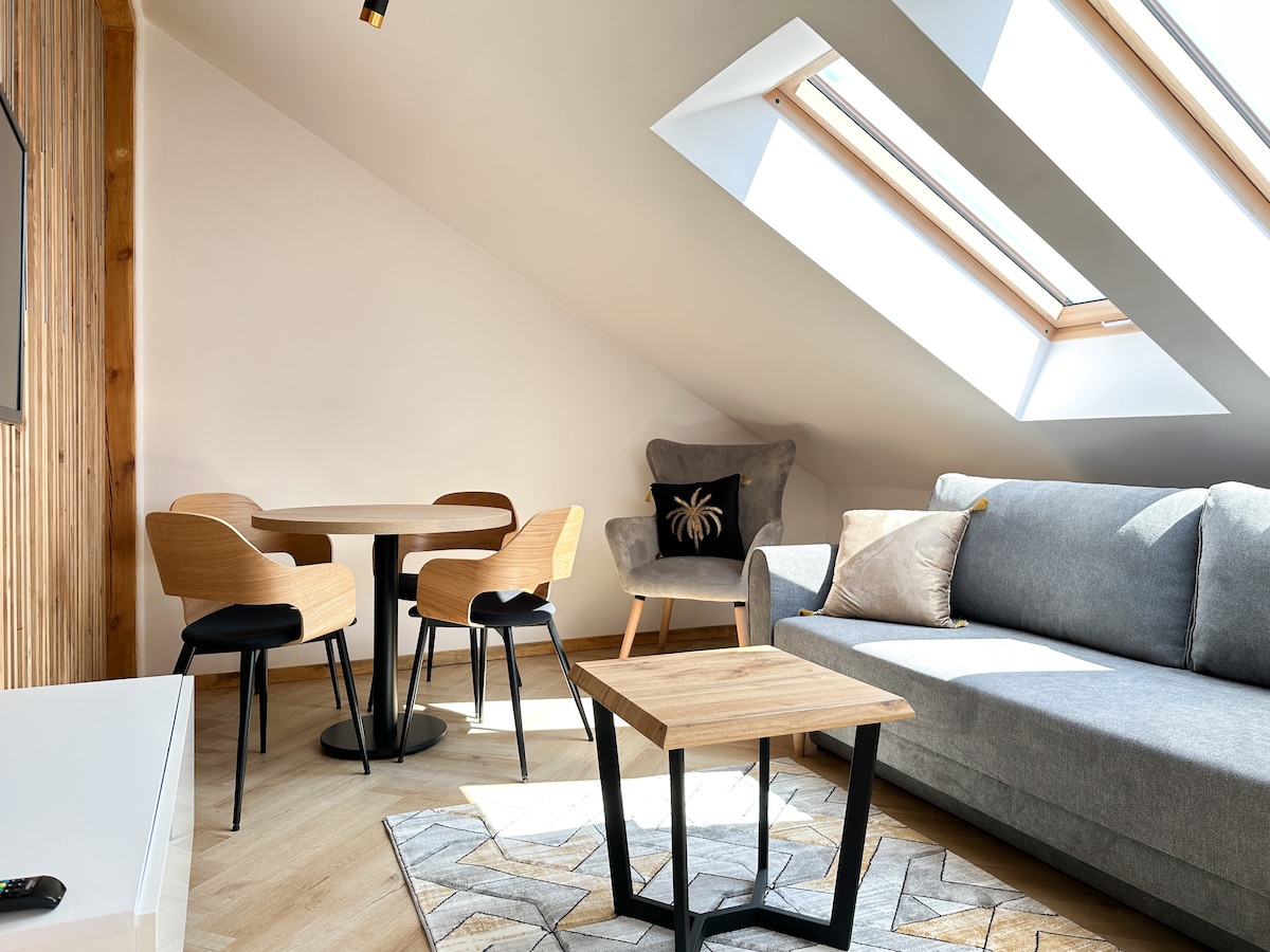 Stúdíóíbúð í loftstíl fyrir 2 manns. Íbúðin samanstendur af fullri vel búinni eldhúsi, svefnherbergi og baðherbergi. Rólegt og friðsælt í kringum, gluggarnir snúa að garðinum með útsýni yfir gróðurinn. Innra rýmið er bjart og rúmgott. Í svefnherberginu er tvöfalt rúm 140 x 200 cm, borð, skápur og hátt borð með tveimur stólum þar sem þú getur ekki aðeins borðað heldur líka unnið. Baðherbergið er með stóra sturtuklefa.