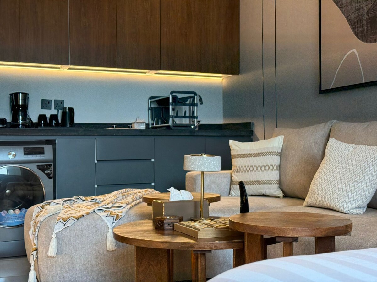 Verið velkomin í íbúðina okkar sem býður þér framúrskarandi gistingu sem fer fram úr væntingum þínum. Í íbúðinni er svefnherbergi með bestu dýnunum sem og aðskilin setustofa með þægilegum sófum með 65 tommu snjallskjá til að njóta(Netflix, Watch, BN) +þráðlausu neti. Eldhúsið er fullbúið til að mæta öllum þörfum þínum. Útivistartími er í boði með sveitahönnun og sérstöku útsýni yfir fjármálamiðstöðina sem hentar vel fyrir viðburði og samkomur með foreldrum og vinum. Íbúðin er búin styttri og langri dvöl. Staðsetningin er frábær í hjarta borgarinnar nálægt áhugaverðum stöðum, þjónustu og veitingastöðum.