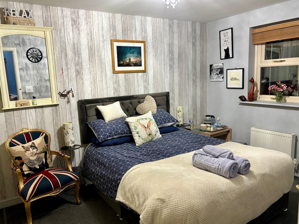 *fyrri umsagnir nauðsynlegar* Litla hlöðin okkar hefur nýlega verið breytt og státar af sérsniðnum eiginleikum, þar á meðal millihæð, nútímalegu eldhúsi og iðnaðarstiga. Njóttu víðáttumikils útsýnis frá glugganum okkar og yfirbyggðri verönd. Gestir geta séð um eigin málsverð áður en þeir sofa á king-size rúmi með dýnu með minnissvampi frá Emmu. Aðliggjandi sturtuherbergi með rennidyrum í hlöðustíl. Úrvalsfestingar fela í sér Mira platínu sturtu og regndanshaus. bómullarlín ÞRÁÐLAUST NET Krá í minna en 3 mínútna göngufæri