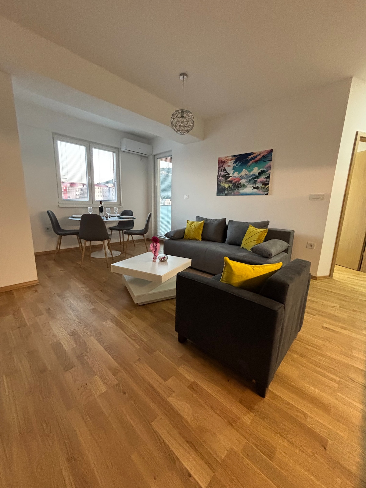 Njóttu glæsilegrar upplifunar á þessum stað miðsvæðis Þetta er GLÆNÝ 60m2 íbúð í 5 mínútna göngufjarlægð frá borgargarðinum (leikvanginum) og frá aðaltorginu. Besta mögulega staðsetningin, nálægt yndislegu götunum í Debar Maalo með mörgum börum og veitingastöðum. Íbúðin er með 1 svefnherbergi með queen-size rúmi og stofu með þægilegum svefnsófa + útdraganlegu rúmi Einnig 2 svalir úr báðum herbergjum, önnur með útsýni yfir Vodno-fjall. Þú getur notað hann til að drekka kaffi eða snæða hádegisverð