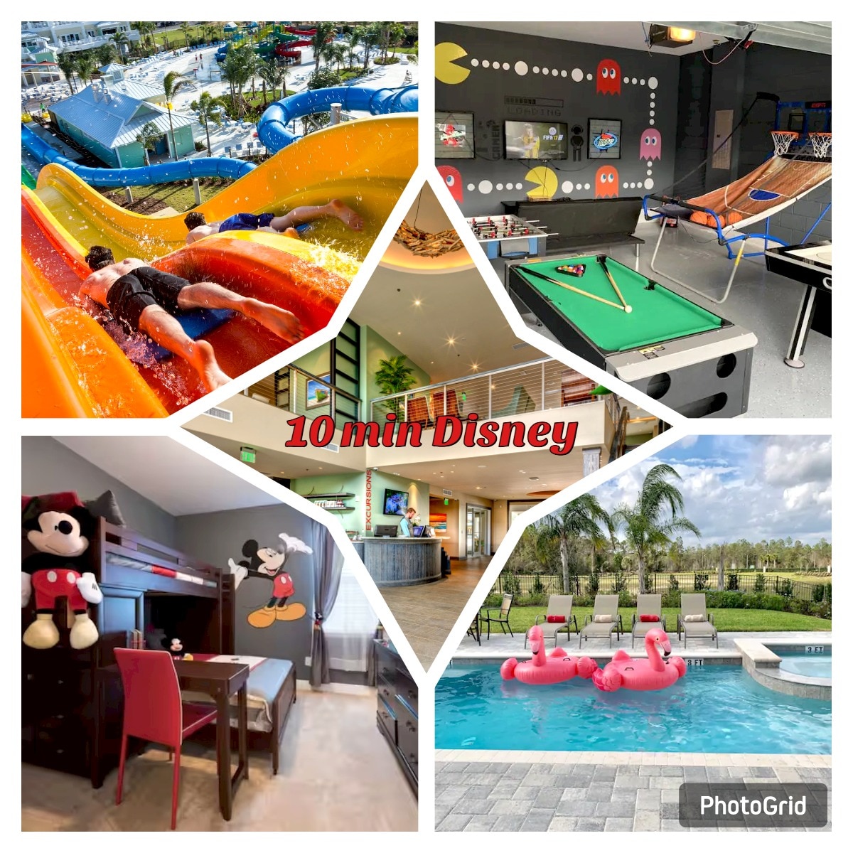 Faglega hannað fyrir ógleymanlega SKEMMTILEGT OG fyrirhafnarlaust frí! ☆ VATNAGARÐUR Á STAÐNUM ☆ LEIKJAHERBERGI með SPILAKASSA og úrvalsleikjastofu ☆ Mjög þægileg rúm. Rúmar allt að 12 gesti ☆ Moana svefnherbergi með sérþema ☆ 2 Luxury King Suites + 1 Queen Suite ☆ Lúxus lín ☆ Einkaupphituð LAUG ☆ Fullbúinn KAFFIBAR ☆ Fullbúið eldhús með eldunaráhöldum og borðbúnaði með aukabúnaði ☆ Poppkornsframleiðandi ☆ Mínútur í Disney World og Universal Studios. ☆ Fjölskylduvæn