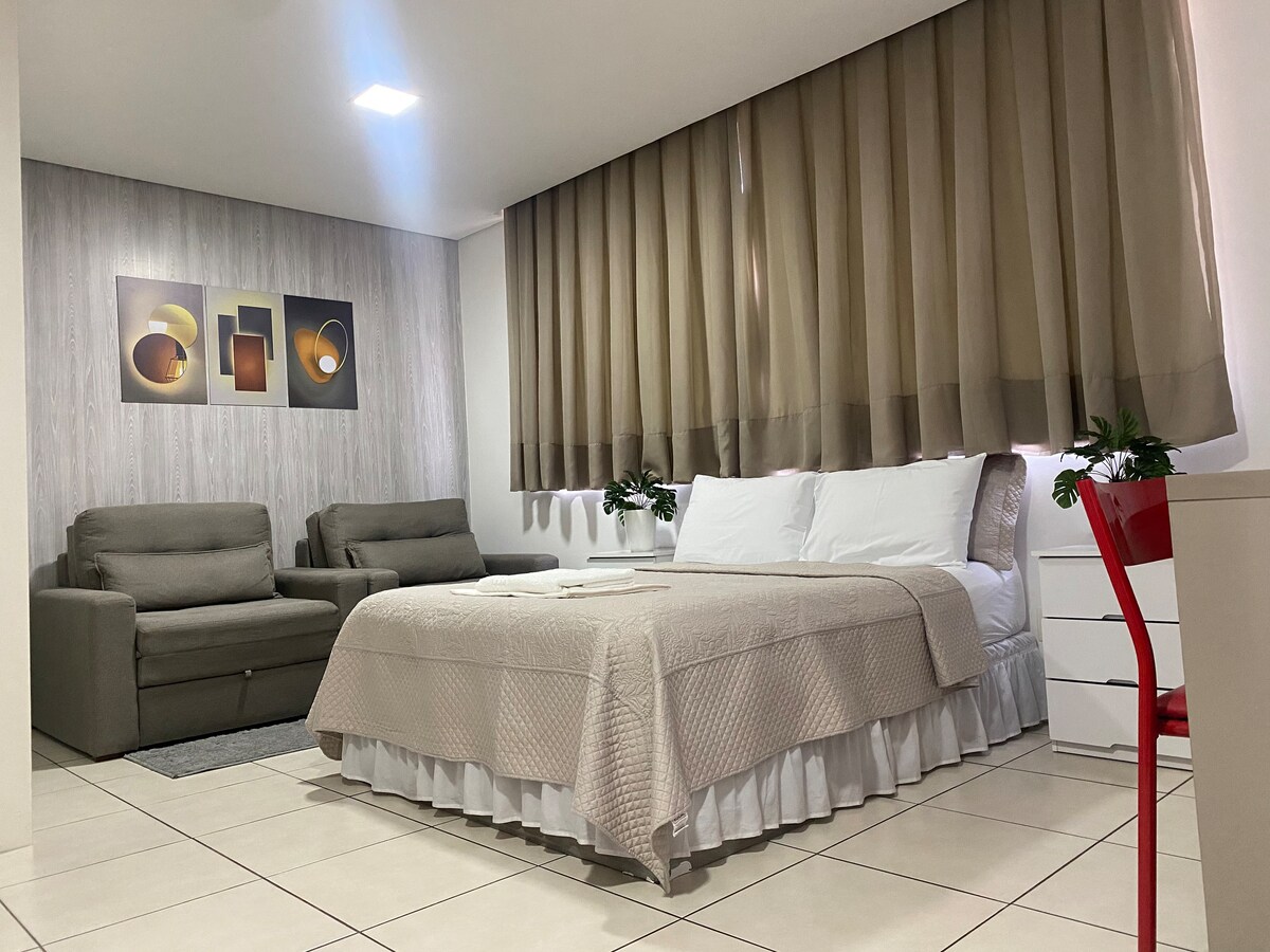 Lúxusris, 45 m2, loftræsting, borð fyrir 4 og borðplata, fullbúið og fullbúið eldhús, þvottavél, þvottavél. Nespressóvél og annað hagnýti. Mjög rúmgott með queen-rúmi, 1 svefnsófa og snjallsjónvarpi með 55'' c þráðlausu neti og neti. Fallegt útsýni! Sameiginlegt útisvæði: Full líkamsræktarstöð, þvottahús, upphituð sundlaug, nuddpottur og gufubað. Forréttinda staðsetning nálægt Diamond, Hosp. Materdei, BH Central Market, Supernossus osfrv. 1 laus staða og 24-tíma einkaþjónn Þægindi sem þú finnur heima!