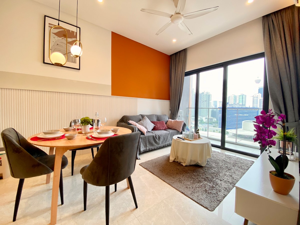 Fyrsta flokks einingin okkar, notaleg heimagisting, er staðsett í CBD og Gullna þríhyrningnum. Býður upp á magnað útsýni frá hinni verðlaunuðu sundlaug á 51. hæð og er umkringd öllum táknrænum turnum Malasíu, þar á meðal KLCC, KL-turninum, Tun Razak Exchange og Warisan Merdeka-turninum. Það er þægilega staðsett í 100 metra fjarlægð frá Conlay MRT-stöðinni, 1 km frá Pavilion Mall, KLCC, TRX og mörgum öðrum vinsælum stöðum í KL. Að auki eru margir valkostir fyrir afhendingu máltíða allan sólarhringinn.