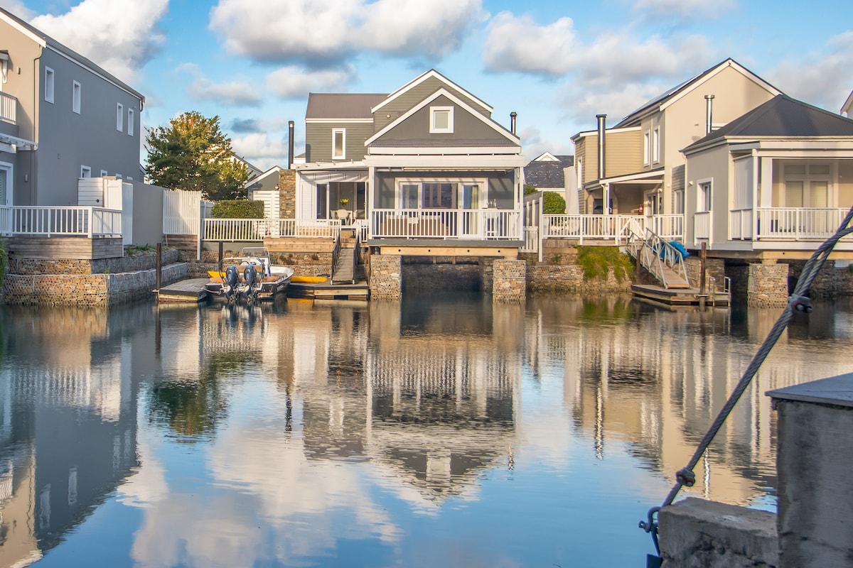 Þetta glæsilega 3ja hæða heimili við Thesen Canal við sjávarsíðuna býður upp á magnað útsýni og frábæra staðsetningu. Njóttu notalegs arins, spennubreytis, rafhlaðna fyrir ljós, sjónvarp og þráðlaust net. Stígðu út að beinum aðgangi að vatnaleiðum fyrir báta, sund eða kajakferðir. Umkringt kyrrlátri náttúru, fuglalífi og afþreyingu eins og hjólreiðum, gönguferðum, tennis, skvass og ósnortnum ströndum. Tilvalið fyrir fjölskyldufrí þar sem verslanir og sælkerastaðir eru í göngufæri. Bókaðu núna til að eiga ógleymanlegt frí!