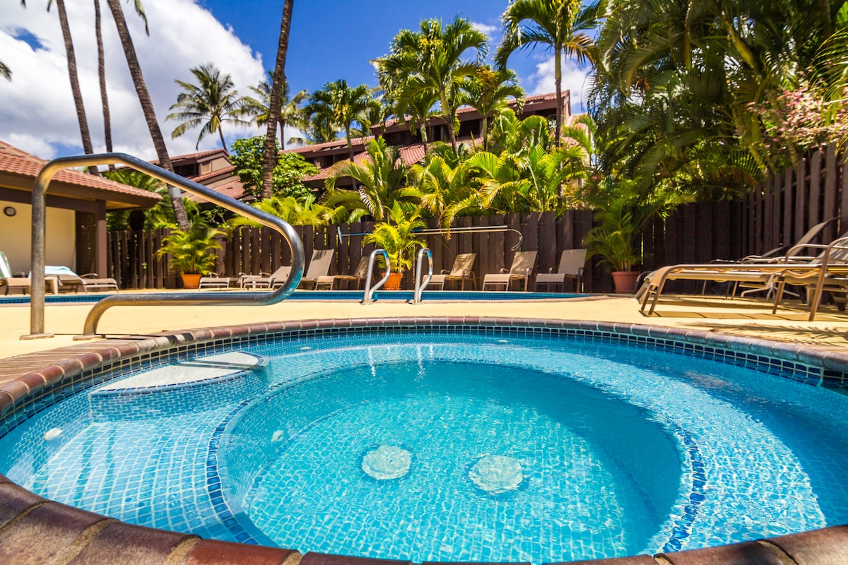 Skjaldbaka í hvalaskoðun! Kihei Resort býður upp á sanna Hawaiian stemningu með sundlaug og heilsulind. 15 mínútur á flugvöllinn og frátekið bílastæði við hliðina á íbúðinni. 2 A/C einingar og margir aukahlutir. Kalepolepo Beach Park er ein af vinsælustu ströndum Maui og er þekkt fyrir hnúfubakaskoðun og fyrir gömlu fisktjörnina sem býður upp á fjölskylduvænt sund með mörgum skjaldbökum, er beint á móti. Helstu matvöruverslanir og verslunarmiðstöðvar eru í innan við 10 mínútna göngufjarlægð.