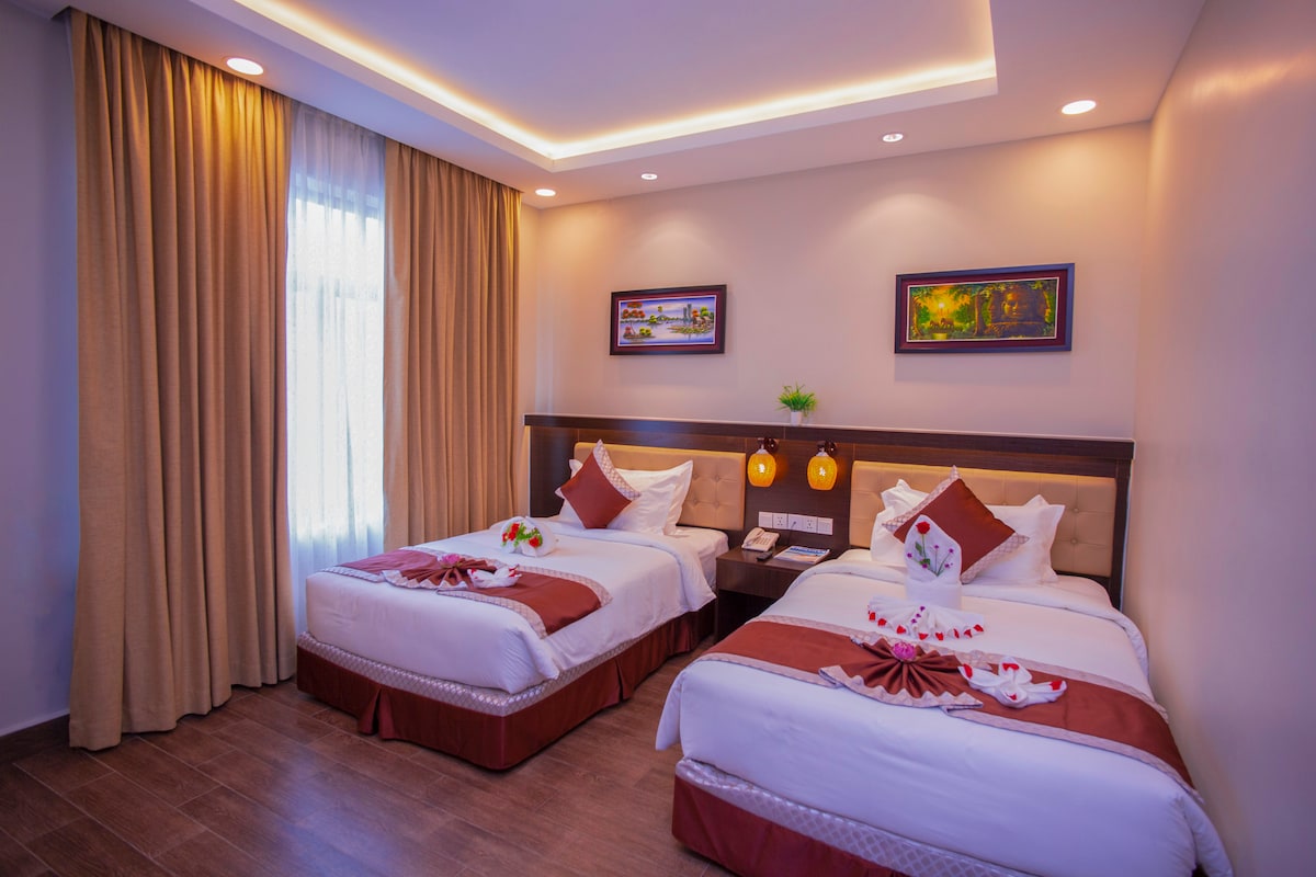 Staðsett í miðbæ Phnom Penh, þú ert aðeins í 10 mínútna fjarlægð frá flestum áhugaverðum stöðum í bænum. Herbergið okkar býður upp á queen-rúm með aircon, ókeypis þráðlaust net, sérbaðherbergi, öryggiskassa, míníbar, kapalsjónvarp, hreint handklæði og önnur þægindi. Einkabílastæði eru í boði. Móttökuteymið okkar aðstoðar þig allan sólarhringinn meðan þú gistir hjá okkur! Famous Genocide Museum and Russian Market is only 5min away while you can reach to Royal Palace and River Front Area only 10min by easily using taxi and Tuk Tuk.