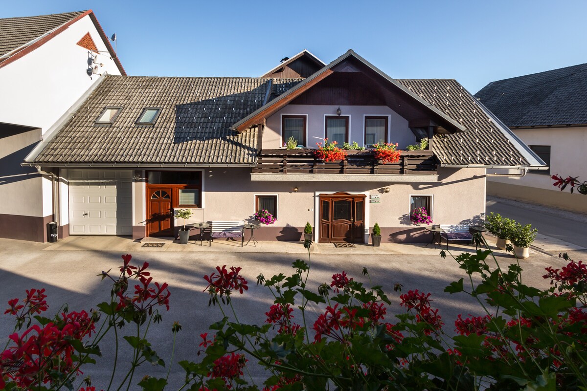 Stökktu út í vin friðar og þæginda í Eco-húsi úr harðri viðarbyggingu með nútímalegri íbúð í 20 mín göngufjarlægð frá Bled-vatni, 15 mín. að ströndinni við ána Sava . Fjarri hávaða frá Bled en á sama tíma nálægt aðgerðinni. Svæðið í kring er fullt af göngu- og hjólastígum.. njóttu einkasvalanna með fuglum og krybbum sem syngja og sofna á king size rúminu (180x200) í sæmilega kældu svefnherbergi ( norðurhlið). Í íbúðinni eru tvær loftræstingar fyrir algjör þægindi. Láttu eins og heima hjá þér