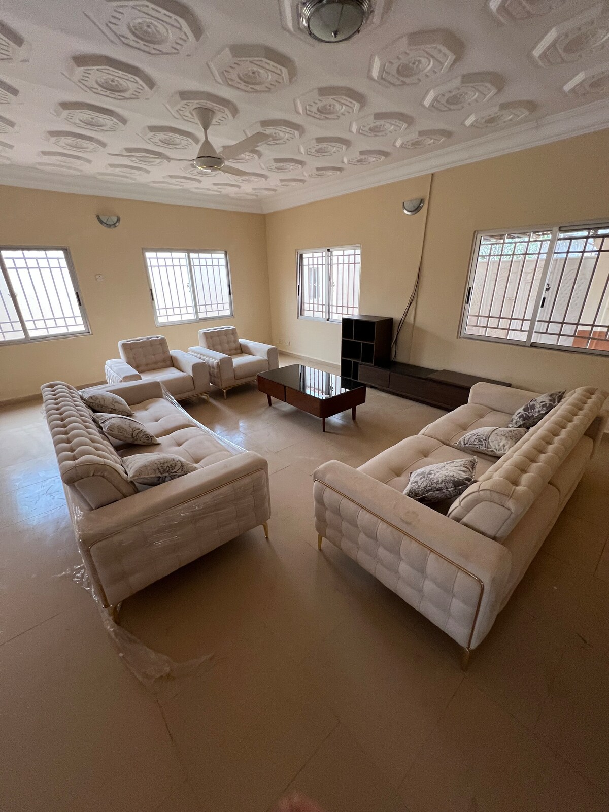 Two living in rooms with 4 bedrooms and 5 baths Located on the edge of Brusubi Phase 1 and Brufut at a brand new estate. 6 - 8 mins drive from Brusubi Turntable and Brufut beach. Senegambia 15 mins drive. AC and Wifi available, free Airport pickup, 2-3 days extensive cleaning, security available, etc. We always aim for return customers so rest assured, great service! Double Sofa bed available and villa could take upto 10 guests.