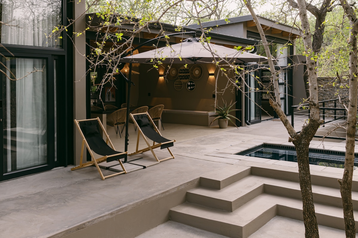Stökktu út í falda gersemi okkar í hjarta afríska runnans til að komast í frábært frí fyrir pör. Afdrepið okkar er staðsett mitt í náttúrunni og býður upp á fullkomna blöndu af einangrun, ævintýrum og náttúru. Veröndin teygir sig út í óbyggðirnar og þar er hægt að fá marga dýragesti. Andaðu að þér hreinu, óspilltu loftinu þegar þú horfir yfir runnann og setlaugina. Forðastu ys og þys hversdagsins og endurvirkjaðu tengsl þín við náttúruna og hvort annað.