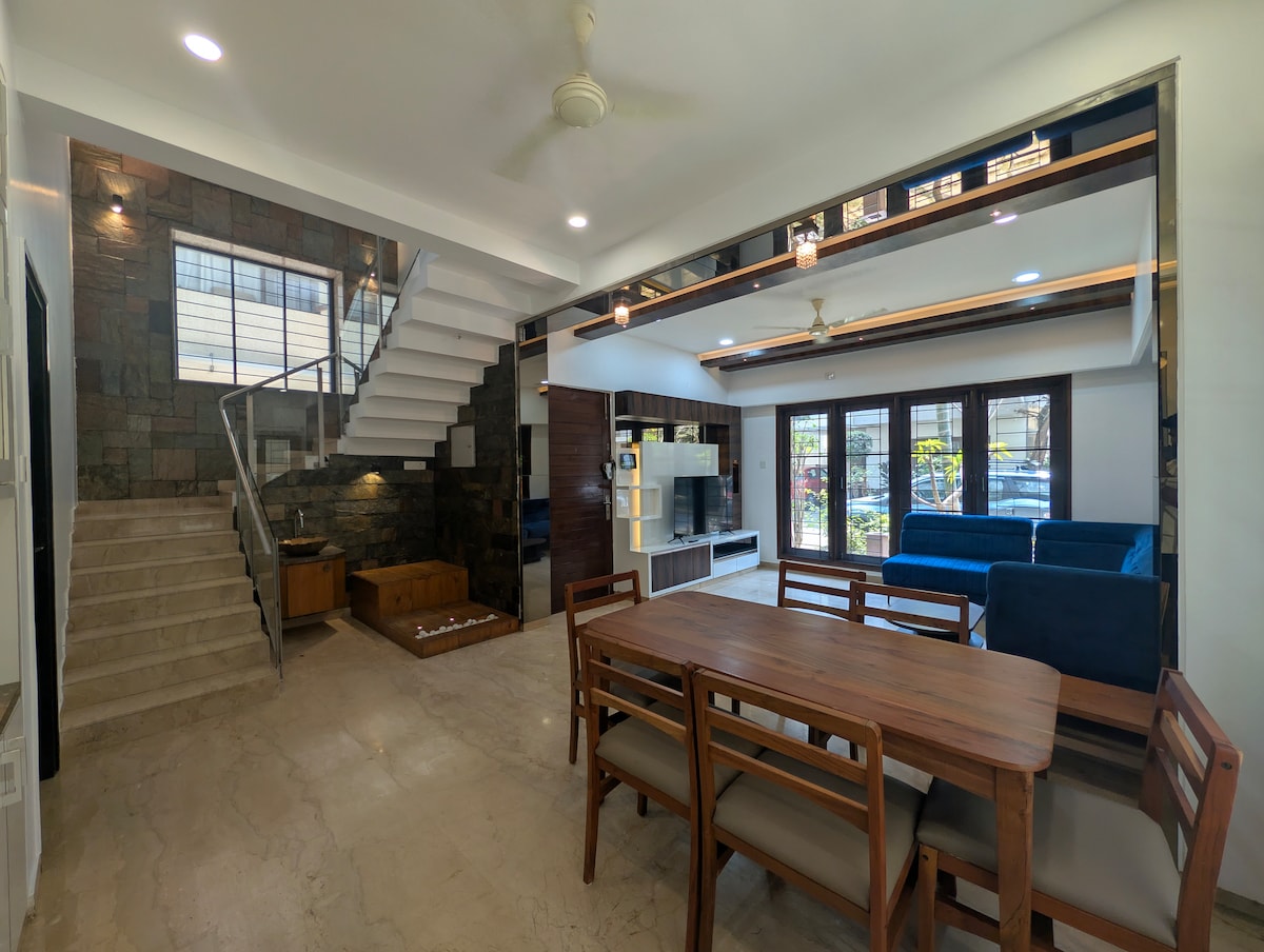 Verið velkomin í snjallt og íburðarmikið frí í friðsæla Green Vista, Mullur! Þessi rúmgóða, sjálfstæða tvíbýlishús er fullkomin fyrir fjölskyldur, fagfólk og hópa sem leita að þægindum, glæsileika og tæknilegum búnaði. ✨ Njóttu bjartra, nútímalegra innréttinga, svefnherbergja með loftkælingu, notalegs barnaherbergis og snjallheimilis 💡 ✨ Eldaðu í fullbúnu eldhúsi, slakaðu á með snjallsjónvarpi og þráðlausu neti eða slakaðu á á svölunum 🌿 ✨ Nærri Wipro Tech Park, Manipal & Columbia Asia sjúkrahúsum og HAL flugvelli ✈️