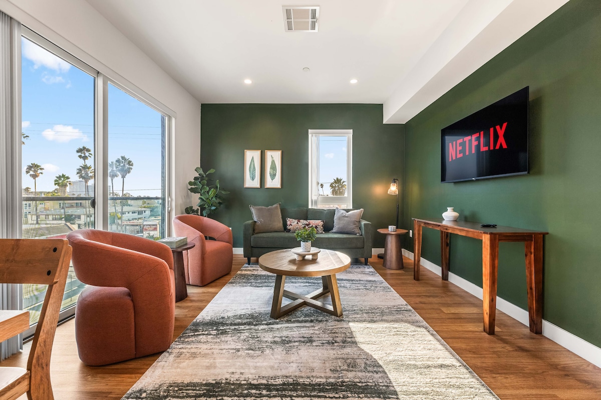 - Ljósfyllt og rúmgott 2BD+1BTH í Korea Town - 1 King-rúm, 1 stórt hjónarúm og vindsæng (fyrir 6) - Fullbúið eldhús með topptækjum - Snjallsjónvörp - Háhraða þráðlaust net og vinnuvæn rými - Þvottavél/þurrkari í einingu - Ókeypis bílastæði við hlið - Gakktu að K-Town veitingastöðum, næturlífi og áhugaverðum stöðum - Auðvelt aðgengi að almenningssamgöngum og helstu stöðum í Los Angeles - Tilvalið fyrir fjölskyldur, hópa eða viðskiptaferðamenn - Pack'n' Play, High-Chair & Baby Bath - Líkamsrækt, þakverönd, leikjaherbergi og fleira