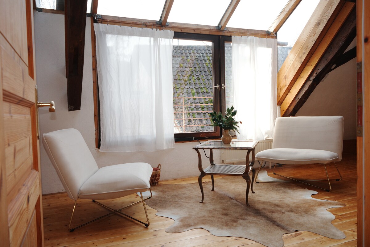 Björt, smekklega innréttuð háaloftsíbúð með um 30 fm. Miðsvæðis í rólegu íbúðahverfi. 3min. ganga að léttlestinni og í 22 mín. í miðbæ Stuttgart. Möguleg sjálfsinnritun/ -útritun í gegnum lyklaboxið. Fullbúið eldhús, þráðlaust net, snjallsjónvarp með Netflix, þvottavél. Íbúðin er eingöngu notuð af gestum okkar. Öll nauðsynleg kaup er hægt að gera í göngufæri. Ókeypis almenningsbílastæði eru í boði við hliðina á húsinu.