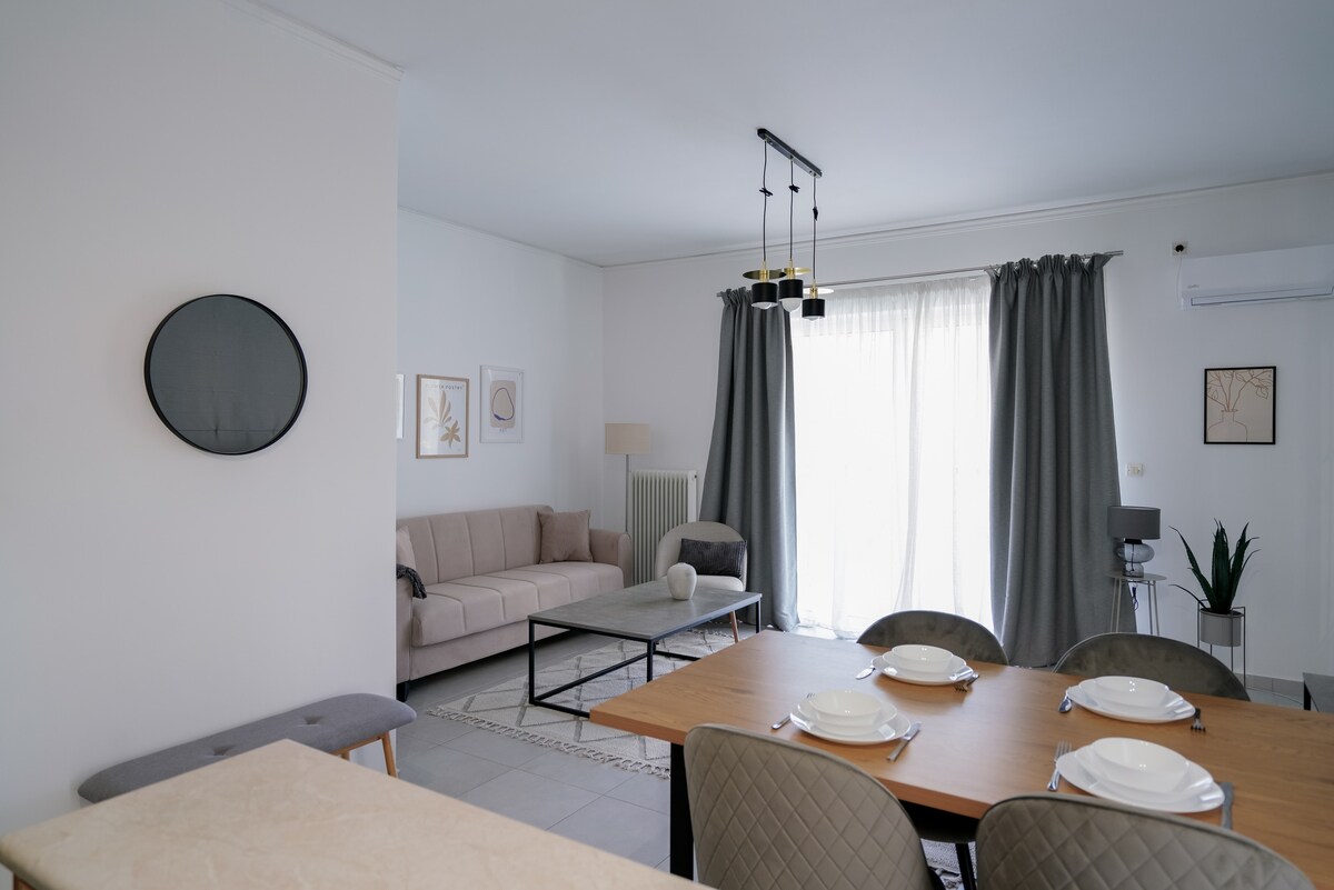 Halló, ég heiti Cetty og ég mæli eindregið með fallegri dvöl í notalegu íbúðinni minni! Hún er staðsett miðsvæðis í Korydallos,nokkrum metrum frá neðanjarðarlestinni. Hún leiðir þig að miðborg Aþenu á 10 mínútum. Á 2. hæð er hún 53 fermetra stór, hentar fyrir 3 einstaklinga! Pastel litirnir og sérstakar skreytingarnar gera það að fullkomnum stað fyrir þægilega dvöl! Þegar komið er inn í íbúðina er stofan, til hægri er eldhúsið og á móti eru stórar svalir með útsýni.