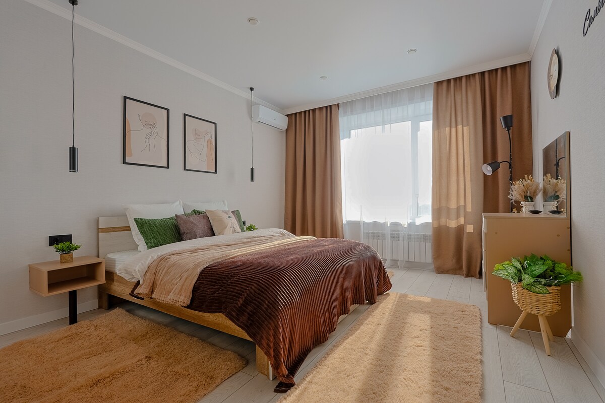 Stúdíóíbúð með einu svefnherbergi í miðborginni með ferskum viðgerðum og nýjum húsgögnum. Staðsett í nýbyggingu sem byggð var árið 2020, með japanskri lyftu. Það er leiksvæði og bílastæði í garðinum. Nálægt: promenade, verslunarmiðstöð, verslunarmiðstöð, Central Park, verslanir, kaffihús. Það er allt sem þú þarft fyrir þægilega dvöl þína: boller, diskar, diskar, ný tæki, hreinlætisvörur, Wi-Fi, gervihnattasjónvarp, snjallsjónvarp, sjónvarp 60 ská. Við útvegum hvers kyns greiðslu- og tilkynningarskjöl.