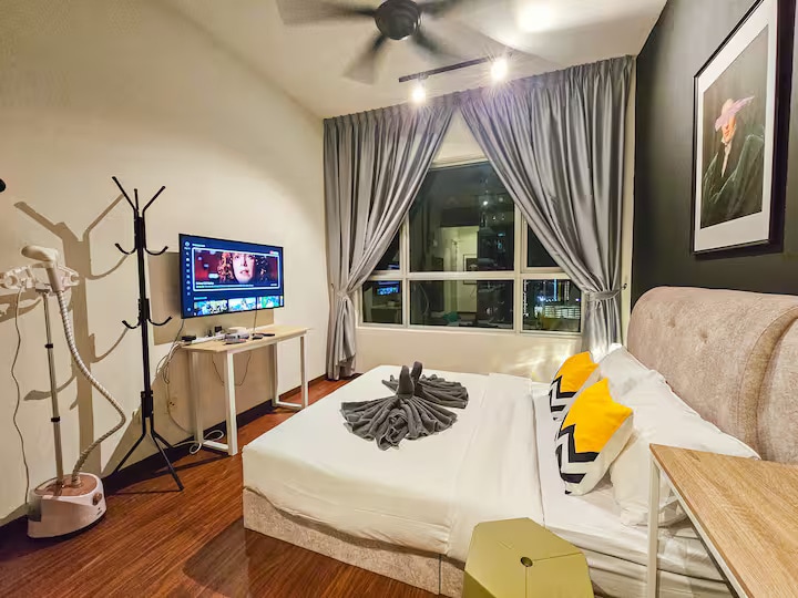 Verið velkomin í stúdíósvítu okkar í þjónustuíbúð fyrir dvalarheimili í Gaya. Nýuppgerð og stílhrein hönnun, mun örugglega gefa þér tilfinningu um að búa í hágæða svítu. Það er kaffihús, veitingastaður, krá og verslanir nálægt íbúðinni í göngufæri. Það er 10 mín akstursfjarlægð til QuaySide Mall sem hefur MBO kvikmyndahús, Bali Veitingastaðir, kínverska veitingastaði...osfrv. Fullkominn staður til að koma saman með vinum!! Bókaðu núna áður en plássið er fullt!