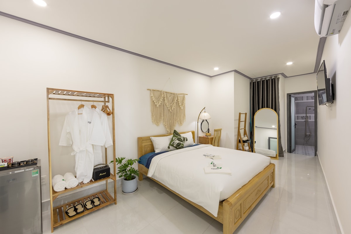 Sveitalegur dvalarstaður sem er ríkur af víetnömskum anda með aðeins 12 litlum einkabústöðum í náttúrunni — aðeins 10 mínútum frá næturmarkaðnum og flugvellinum. Njóttu friðsællar einkastrandar við hliðina á líflegum bar með glæsilegum elddansi á hverju kvöldi. Í hverju litlu íbúðarhúsi er hengirúm, notalegur sófi, ofnar körfur og flott terrakotta-flísagólf. Við notum vatnshreinsitæki og takmörkum plastnotkun. Hlýlegt og sameiginlegt eldhús gerir þér kleift að útbúa léttar máltíðir umkringdar mjúkum faðmi sjávarins.
