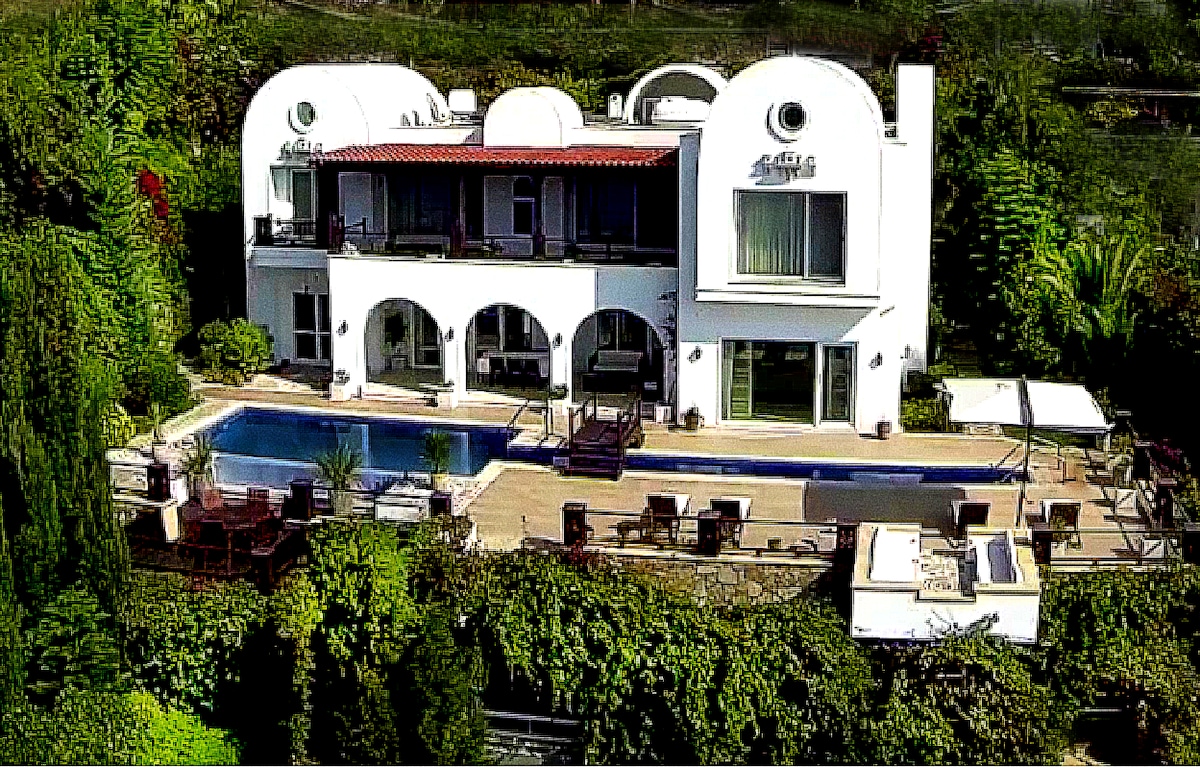 Einstakt útsýni og sérstakur staður í einu fallegasta horni Gündoğan Bay - Kucukbuk. 420m2 risastór villa í hjarta Bodrum. Villa er staðsett í göngufæri við hafið (15 mín). Luxury Villa er í einkasamstæðu með öryggis- og einkasundlaug. Húsið er með 140 m2 verönd með borðkrók og aðra verönd með borgar- og sjávarútsýni og 1 görðum fyrir utan með grilli Það eru 2 mismunandi eldhús og 2 stofur í villunni sem er hönnuð sem kvikmyndaherbergi.
